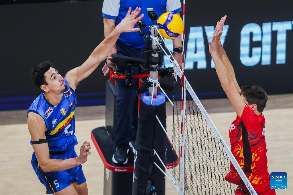 Alessandro Michieletto (L) of Italy competes during the quarterfinal match between Italy and Belgium at the FIVB Men's World Championship 2025 in Pasay City, the Philippines, Sept. 24, 2025. (Xinhua/Rouelle Umali)