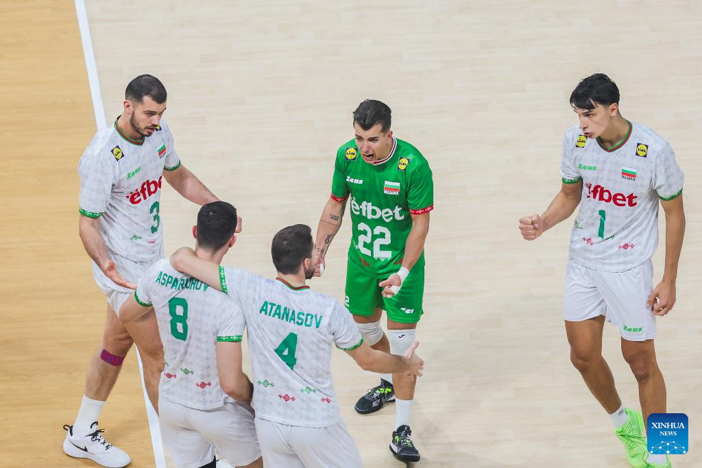 Players of Bulgaria celebrate scoring during the quarterfinals match between Bulgaria and the United States at the FIVB Men's World Championship 2025 in Pasay City, the Philippines, on Sept. 25, 2025. (Xinhua/Rouelle Umali)
