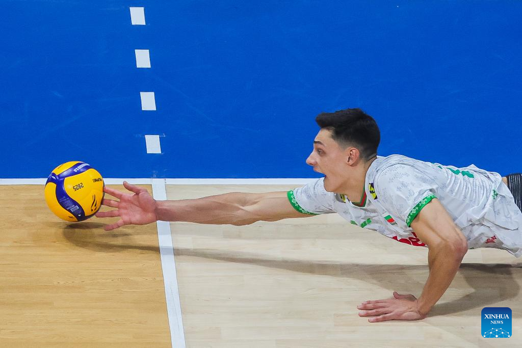 Aleksandar Nikolov of Bulgaria saves the ball during the quarterfinals match between Bulgaria and the United States at the FIVB Men's World Championship 2025 in Pasay City, the Philippines, on Sept. 25, 2025. (Xinhua/Rouelle Umali)