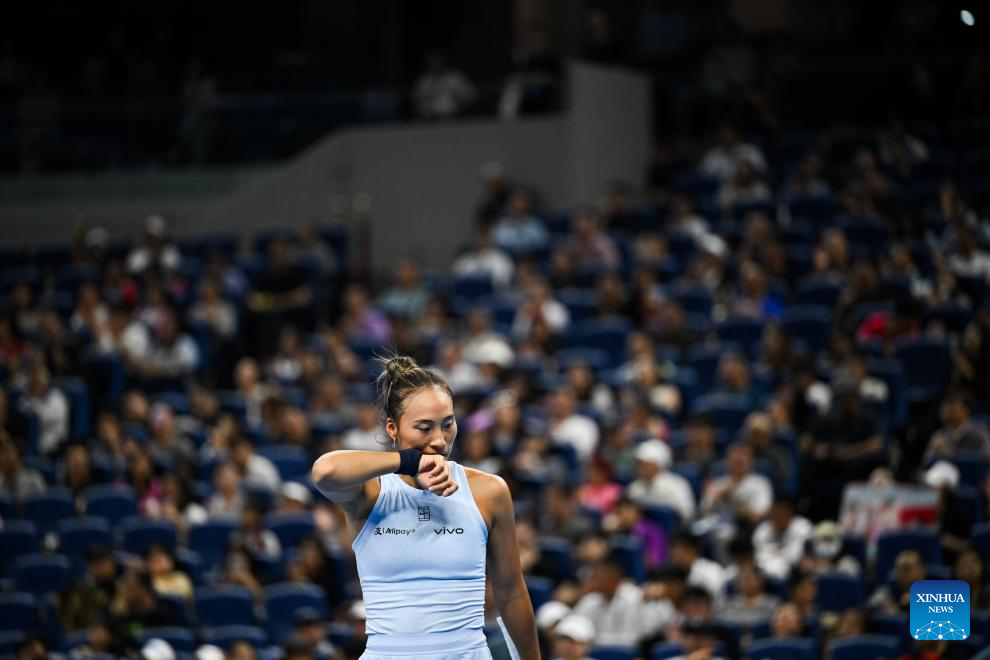 Zheng Qinwen is seen during the women's singles third round match between Zheng Qinwen of China and Linda Noskova of the Czech Republic at 2025 China Open tennis tournament in Beijing, China, Sept. 29, 2025. (Xinhua/Xin Mengchen)