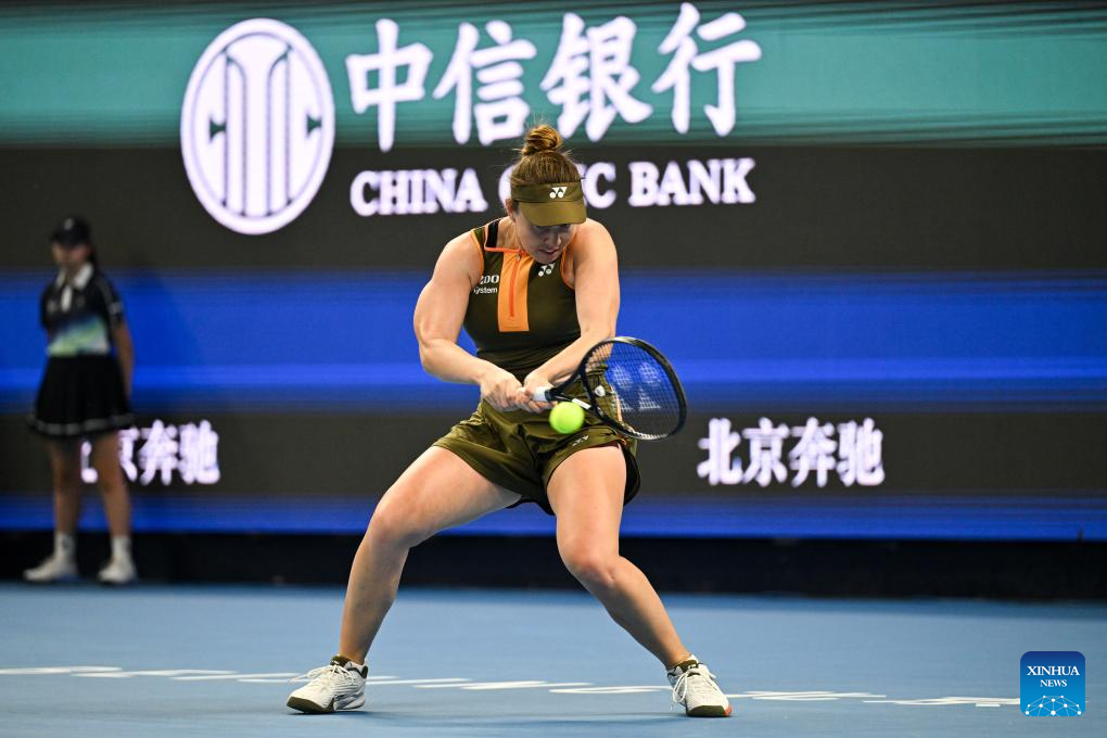 Linda Noskova hits a return during the women's singles third round match between Zheng Qinwen of China and Linda Noskova of the Czech Republic at 2025 China Open tennis tournament in Beijing, China, Sept. 29, 2025. (Xinhua/Xin Mengchen)