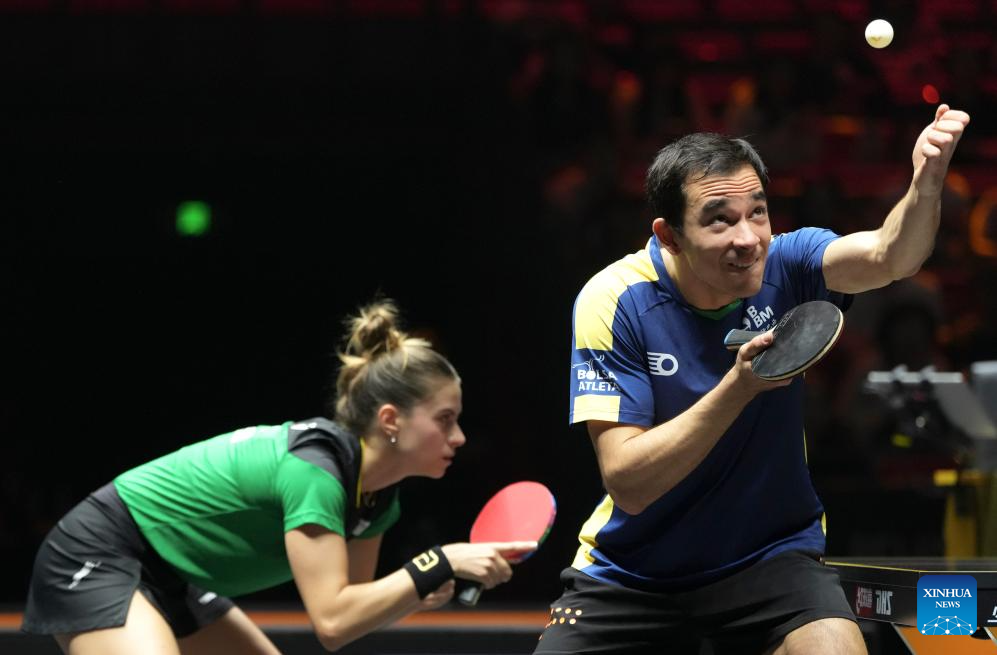 Hugo Calderano (L)/Bruna Takahashi of Brazil compete during the mixed doubles round of 16 match between Xue Fei/Qian Tianyi of China and Hugo Calderano/Bruna Takahashi of Brazil at 2025 World Table Tennis (WTT) China Smash in Beijing, China, Sep. 30, 2025. (Xinhua/Sun Fei)