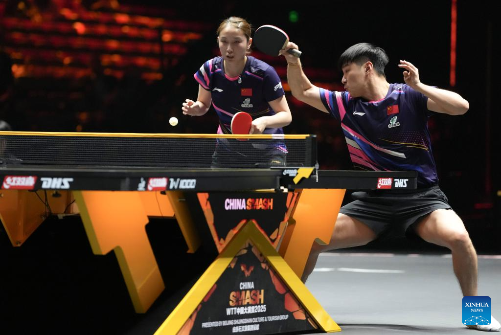 Wang Chuqin (L)/Sun Yingsha of China compete during the mixed doubles round of 16 match against Aditya Sareen of Australia/Yashaswini Ghorpade of India at 2025 World Table Tennis (WTT) China Smash in Beijing, China, Sept. 30, 2025. (Xinhua/Sun Fei)