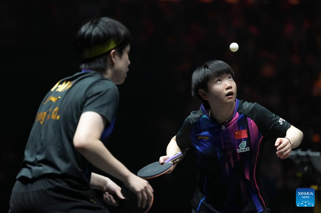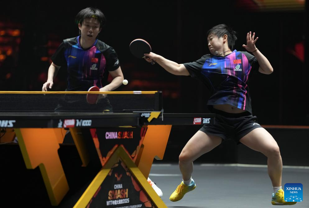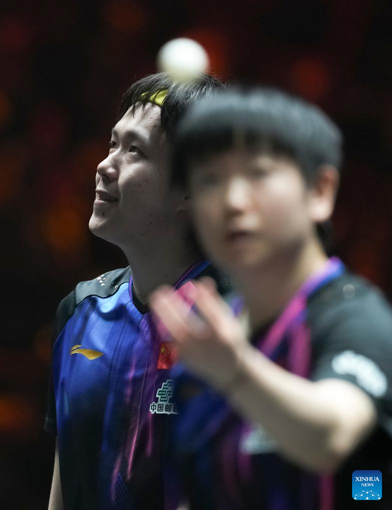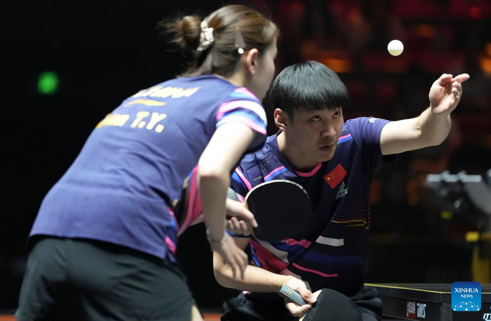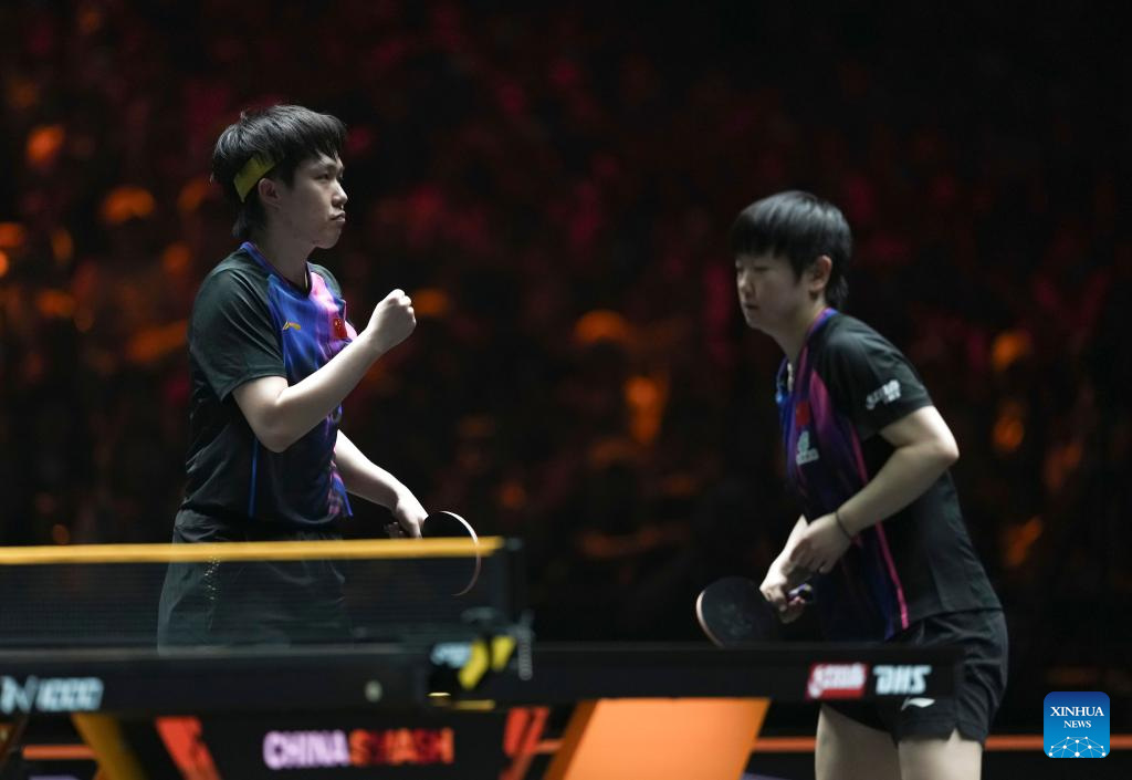 Wang Chuqin/Sun Yingsha (R) of China compete during the mixed doubles round of 16 match against Aditya Sareen of Australia/Yashaswini Ghorpade of India at 2025 World Table Tennis (WTT) China Smash in Beijing, China, Sept. 30, 2025. (Xinhua/Sun Fei)