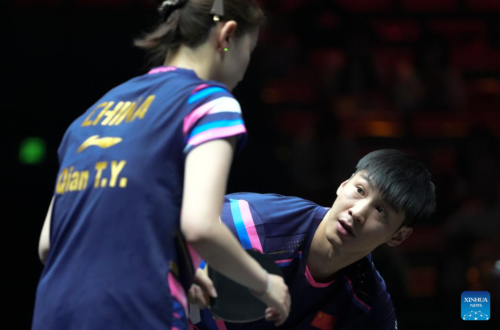 Xue Fei (R)/Qian Tianyi of China communicate during the mixed doubles round of 16 match between Xue Fei/Qian Tianyi of China and Hugo Calderano/Bruna Takahashi of Brazil at 2025 World Table Tennis (WTT) China Smash in Beijing, China, Sep. 30, 2025. (Xinhua/Sun Fei)