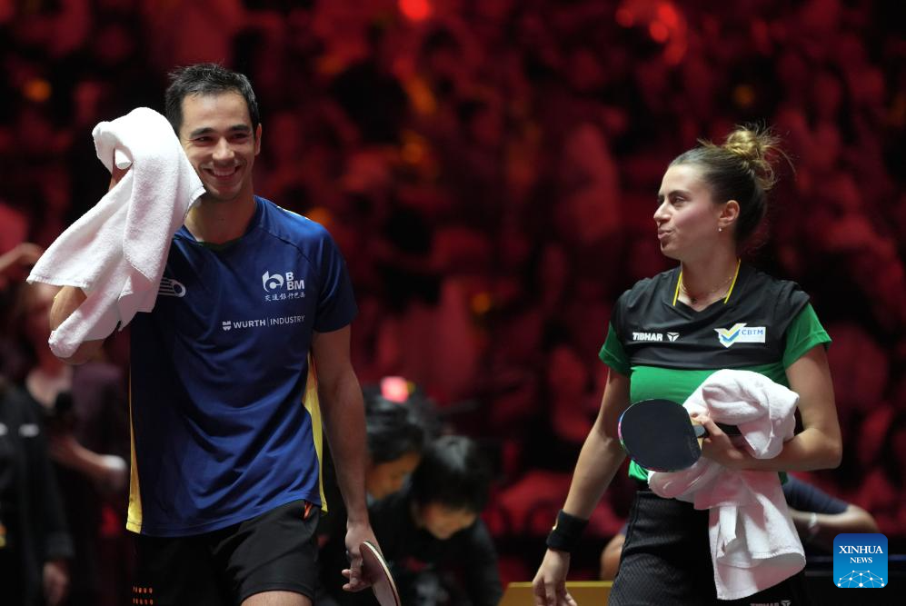 Hugo Calderano (L)/Bruna Takahashi of Brazil react after the mixed doubles round of 16 match between Xue Fei/Qian Tianyi of China and Hugo Calderano/Bruna Takahashi of Brazil at 2025 World Table Tennis (WTT) China Smash in Beijing, China, Sep. 30, 2025. (Xinhua/Sun Fei)