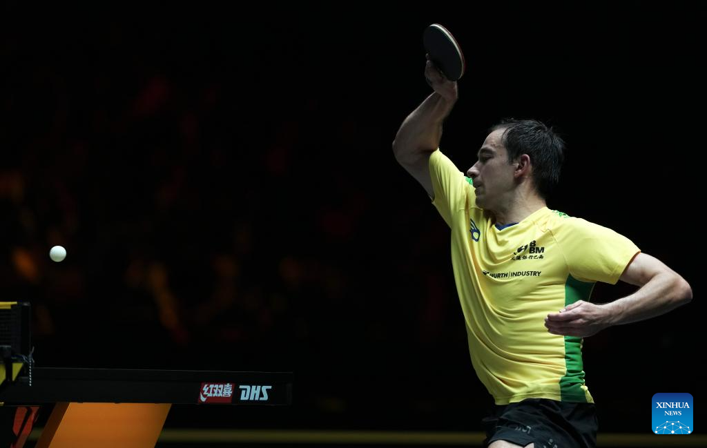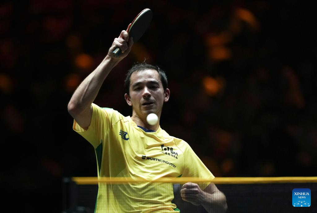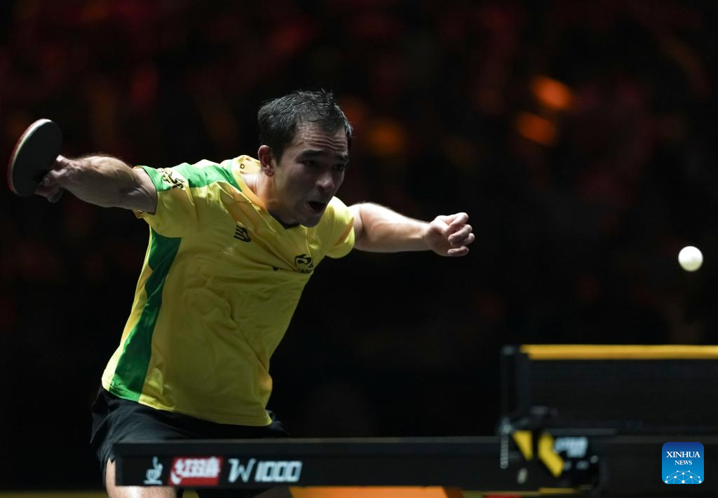 Hugo Calderano of Brazil hits a return during the men's singles round of 32 match against Simon Gauzy of France at 2025 World Table Tennis (WTT) China Smash in Beijing, China, Sept. 30, 2025. (Xinhua/Sun Fei)