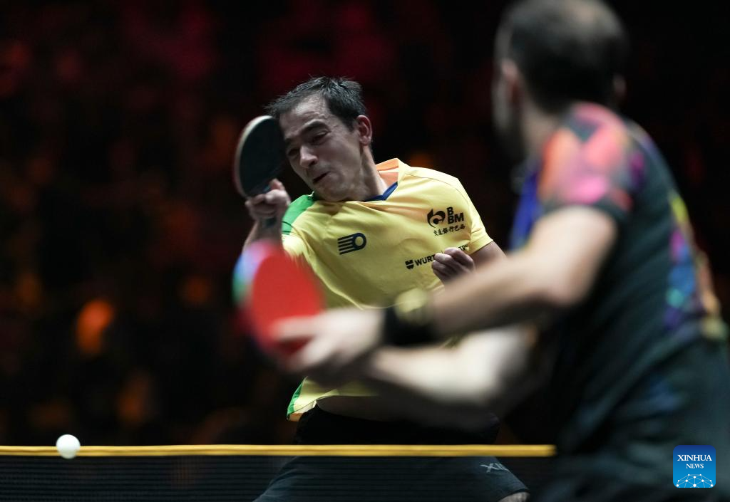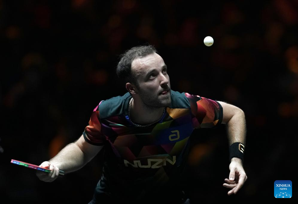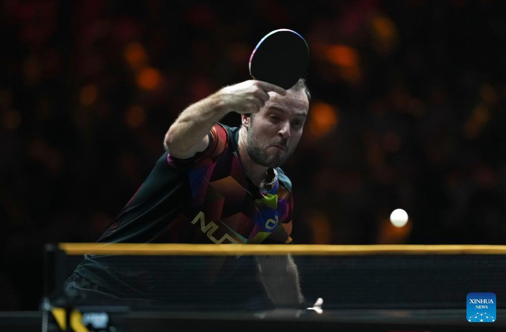 Simon Gauzy of France hits a return during the men's singles round of 32 match against Hugo Calderano of Brazil at 2025 World Table Tennis (WTT) China Smash in Beijing, China, Sept. 30, 2025. (Xinhua/Sun Fei)