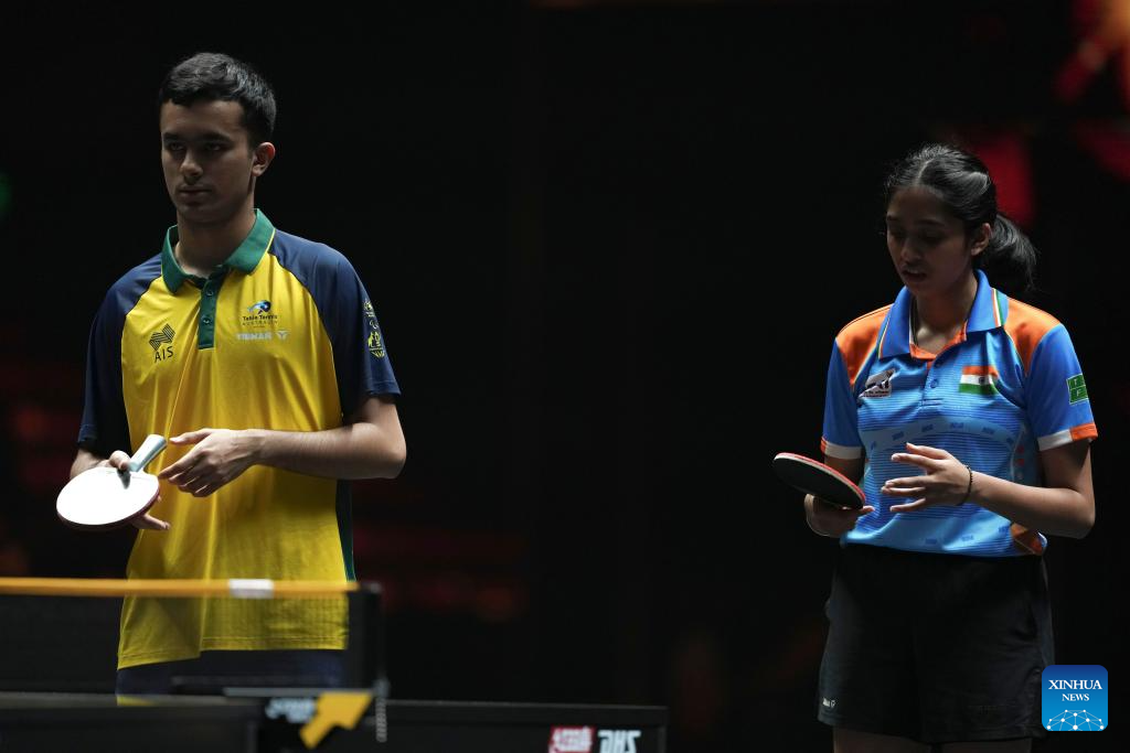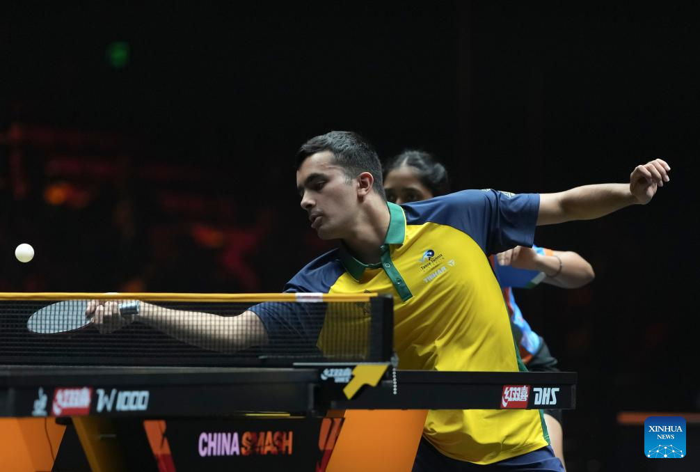 Aditya Sareen (front) of Australia/Yashaswini Ghorpade of India compete during the mixed doubles round of 16 match against Wang Chuqin/Sun Yingsha of China at 2025 World Table Tennis (WTT) China Smash in Beijing, China, Sept. 30, 2025. (Xinhua/Sun Fei)