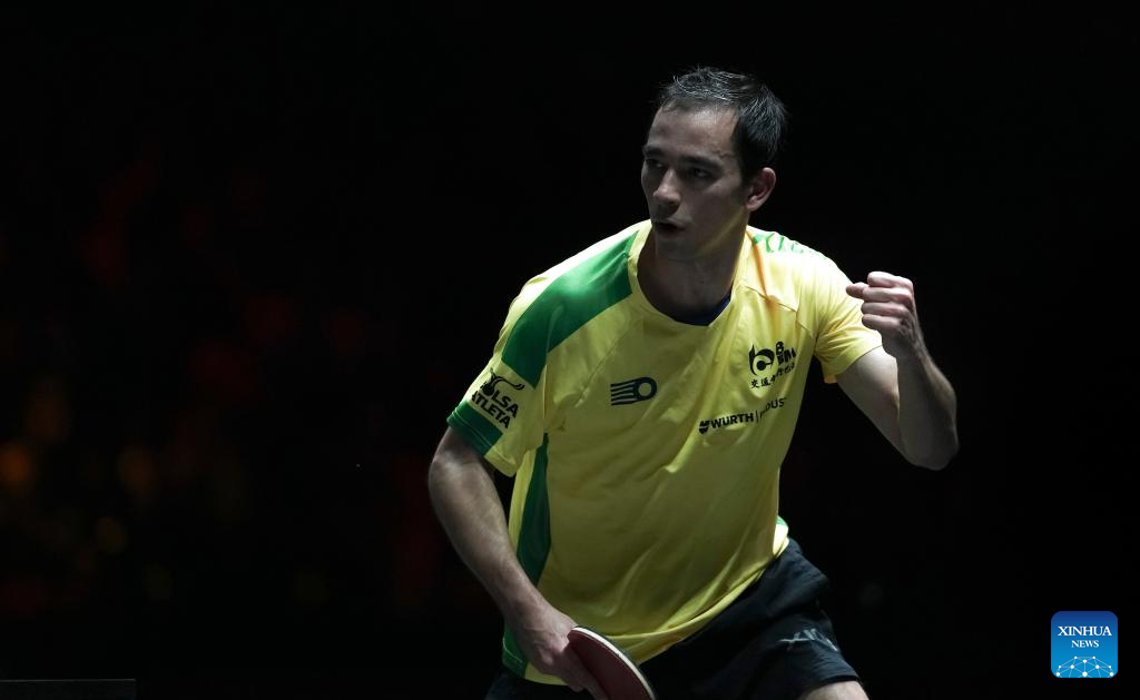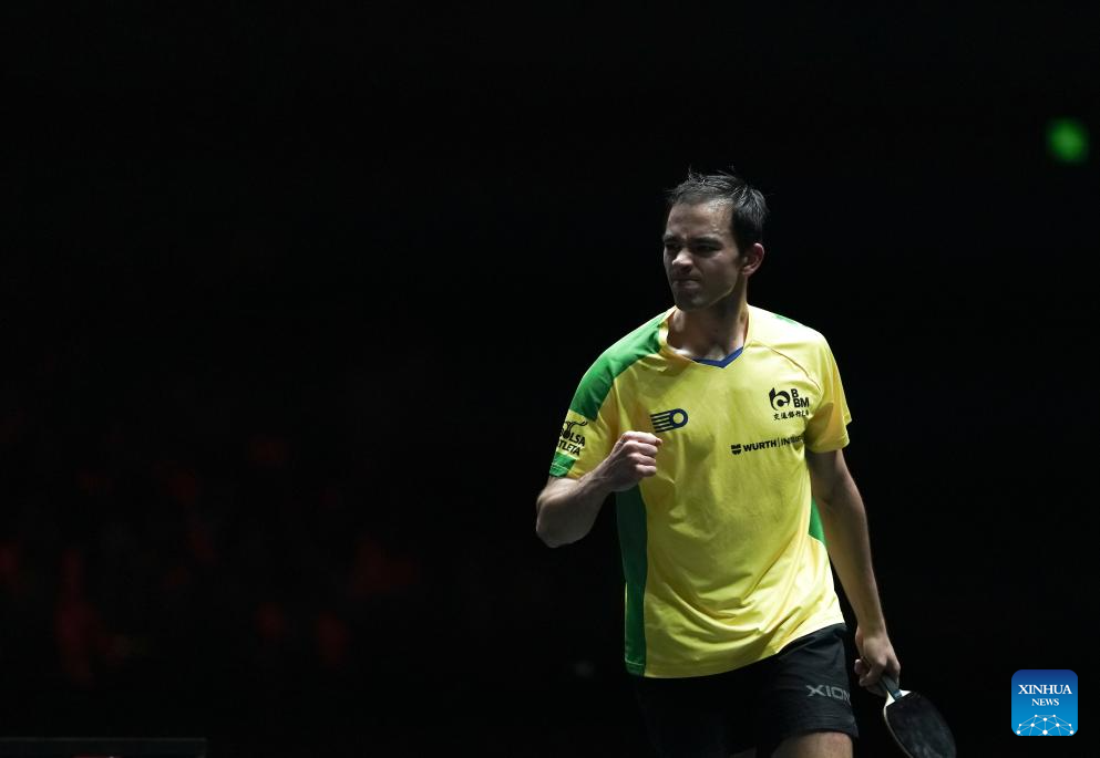 Hugo Calderano of Brazil celebrates a score during the men's singles round of 32 match against Simon Gauzy of France at 2025 World Table Tennis (WTT) China Smash in Beijing, China, Sept. 30, 2025. (Xinhua/Sun Fei)