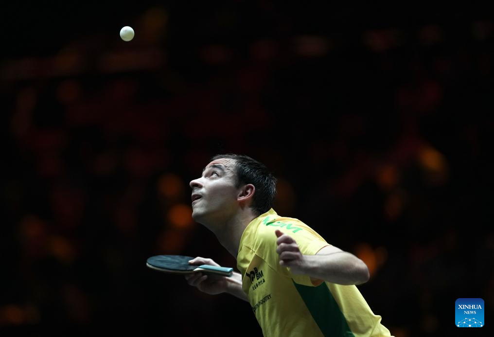 Simon Gauzy of France serves during the men's singles round of 32 match against Hugo Calderano of Brazil at 2025 World Table Tennis (WTT) China Smash in Beijing, China, Sept. 30, 2025. (Xinhua/Sun Fei)