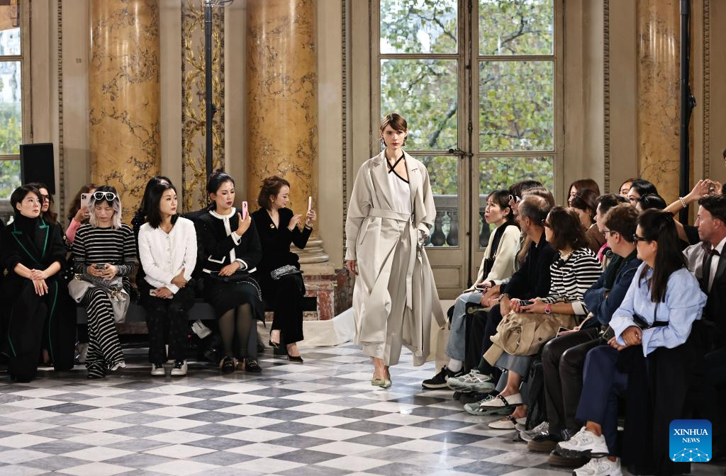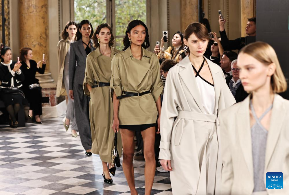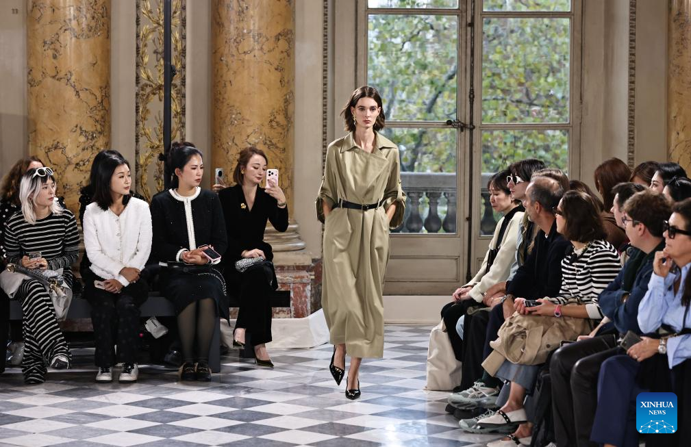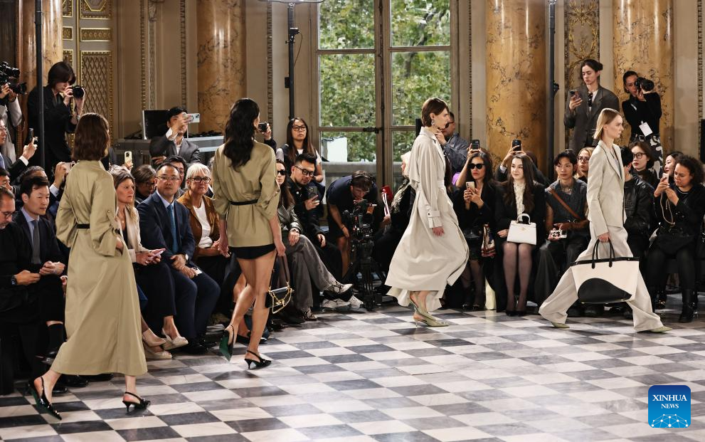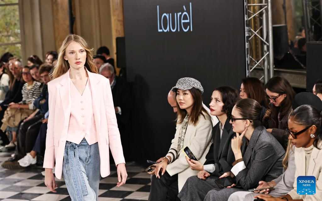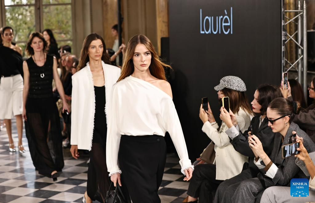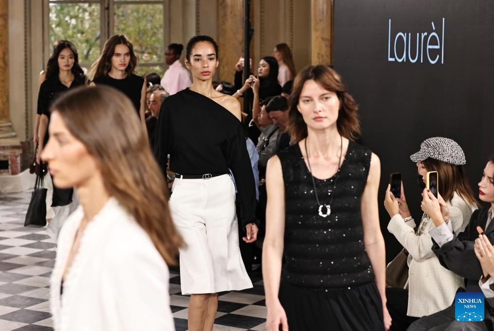 Models present creations from the spring/summer 2026 collections by Laurèl at the Shenzhen Futian Fashion Day Paris event held during the Paris fashion week in Paris, France, Sept. 29, 2025. (Xinhua/Gao Jing)