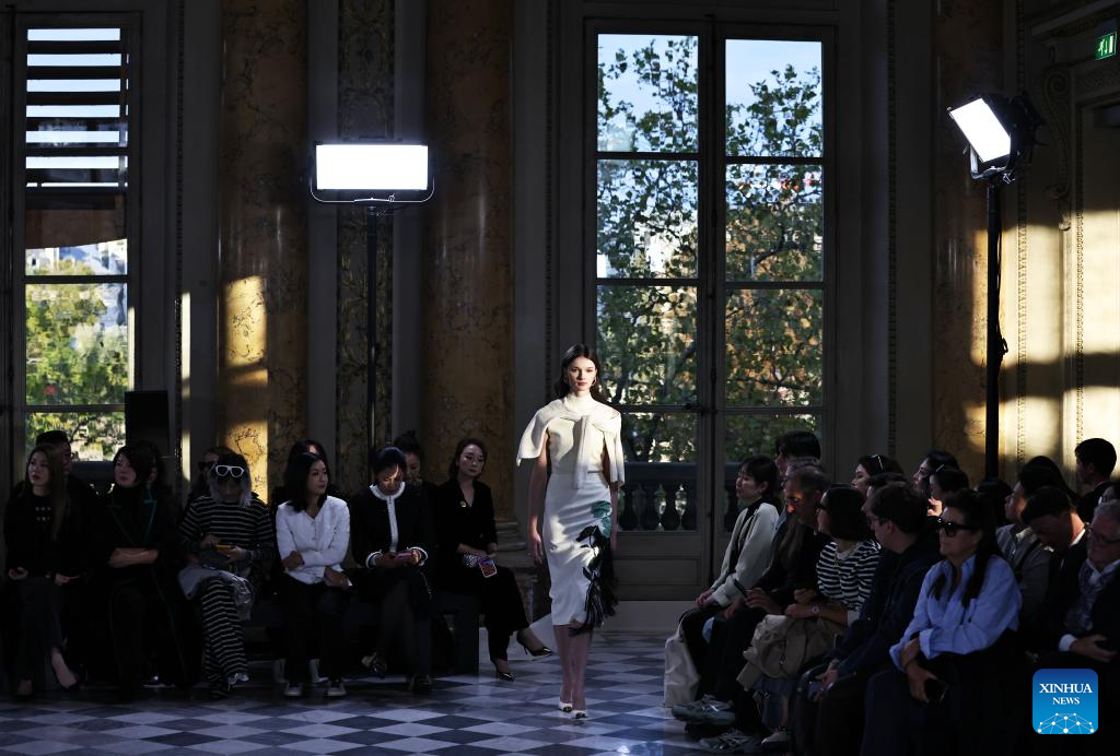 A model presents a creation from the spring/summer 2026 collections by YINER at the Shenzhen Futian Fashion Day Paris event held during the Paris fashion week in Paris, France, Sept. 29, 2025. (Xinhua/Gao Jing)