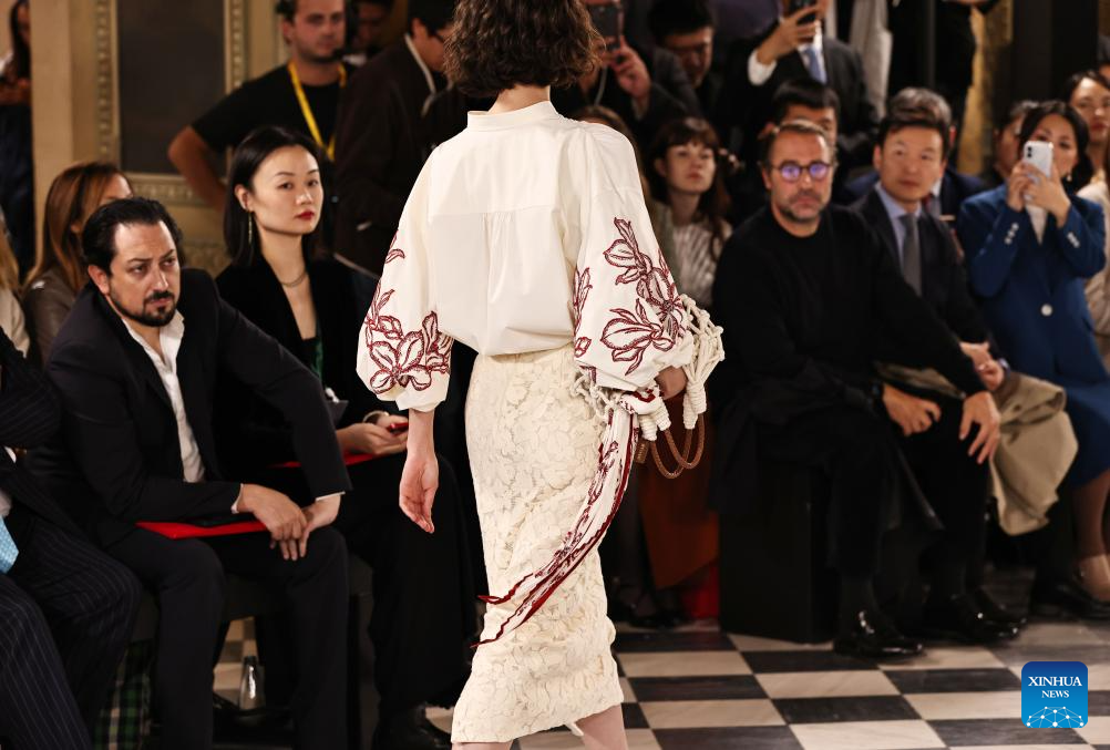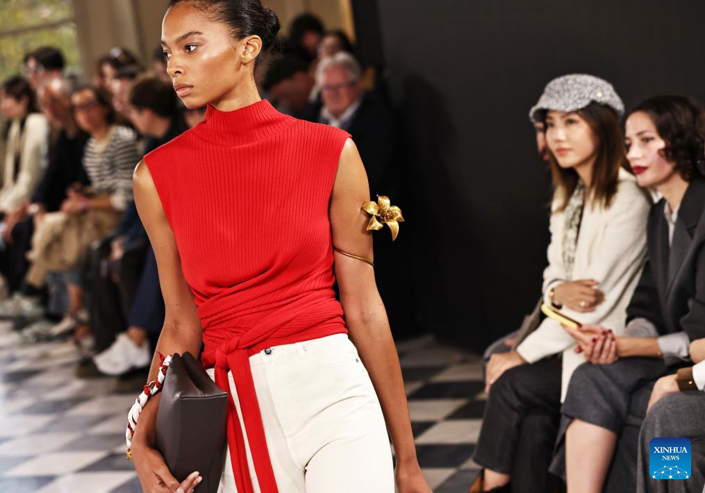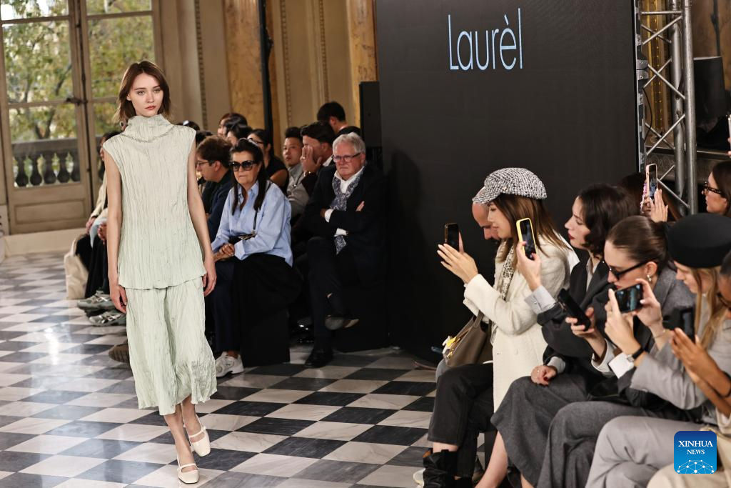 A model presents a creation from the spring/summer 2026 collections by Laurèl at the Shenzhen Futian Fashion Day Paris event held during the Paris fashion week in Paris, France, Sept. 29, 2025. (Xinhua/Gao Jing)