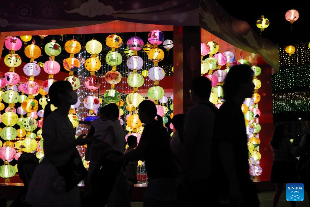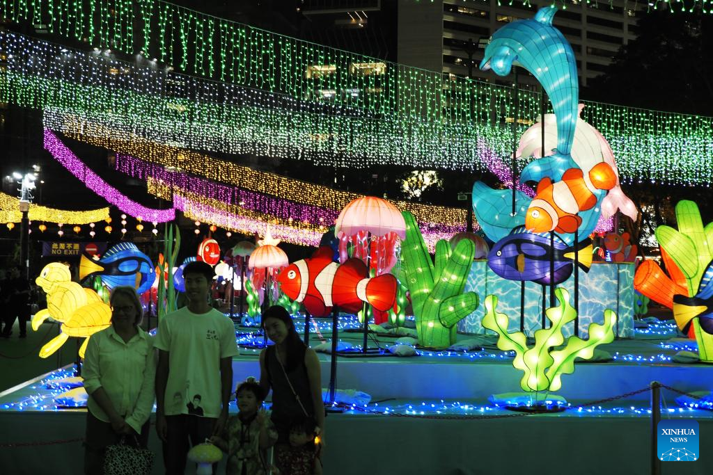 People visit a lantern fair marking the upcoming Mid-Autumn Festival and National Day at Victoria Park in Hong Kong, south China, Sept. 30, 2025. (Photo by Wang Shen/Xinhua)