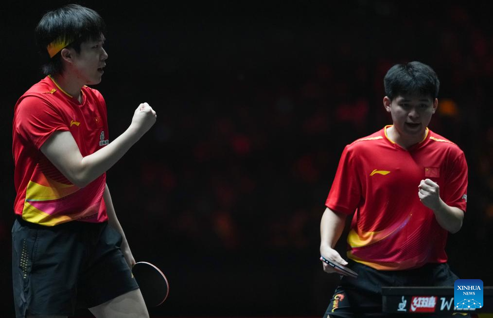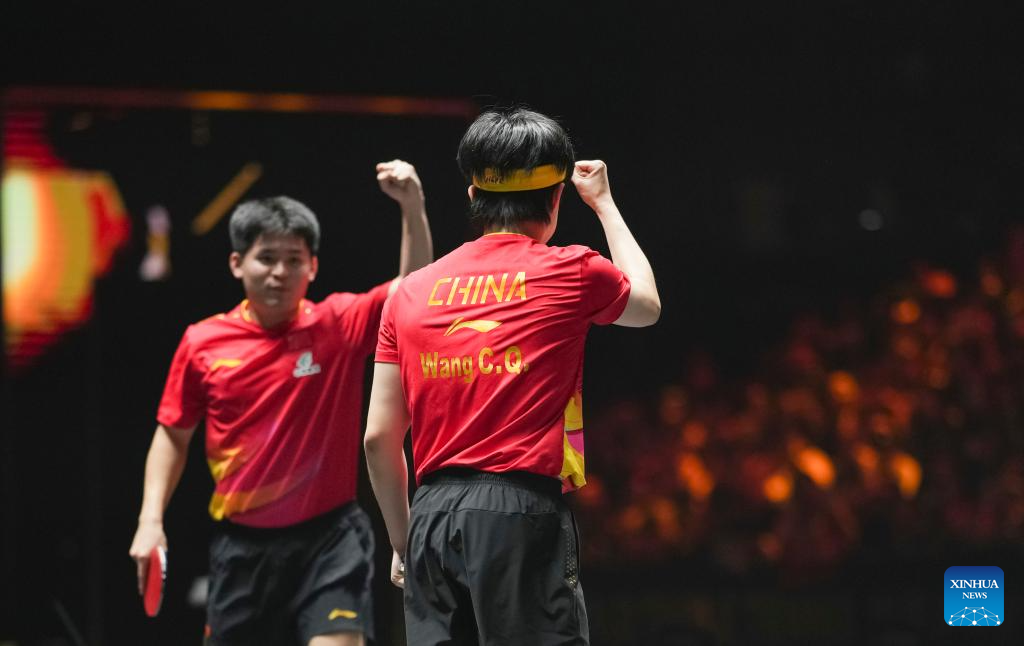 Lin Shidong/Wang Chuqin (L) of China celebrate during the men's doubles quarterfinal match against Yuan Licen/Xu Yingbin of China at 2025 World Table Tennis (WTT) China Smash in Beijing, China, Oct. 2, 2025. (Xinhua/Sun Fei)