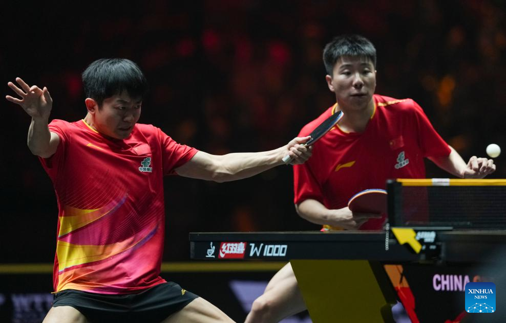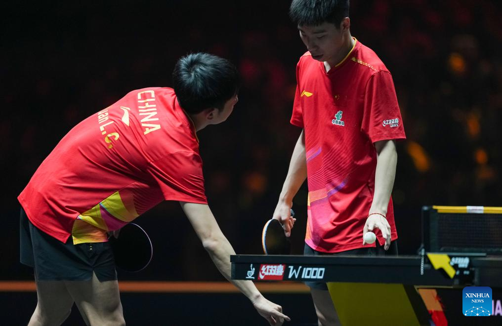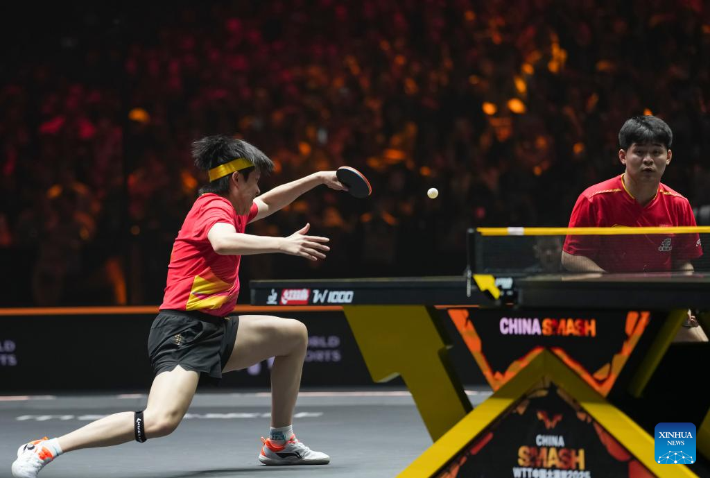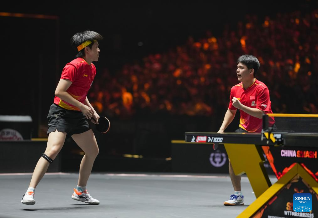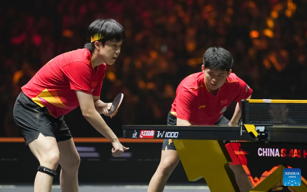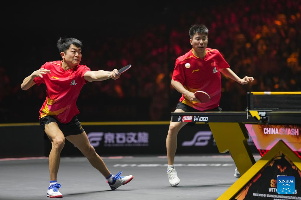 Lin Shidong/Wang Chuqin (L) of China compete during the men's doubles quarterfinal match against Yuan Licen/Xu Yingbin of China at 2025 World Table Tennis (WTT) China Smash in Beijing, China, Oct. 2, 2025. (Xinhua/Sun Fei)