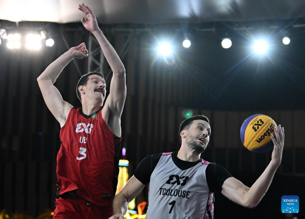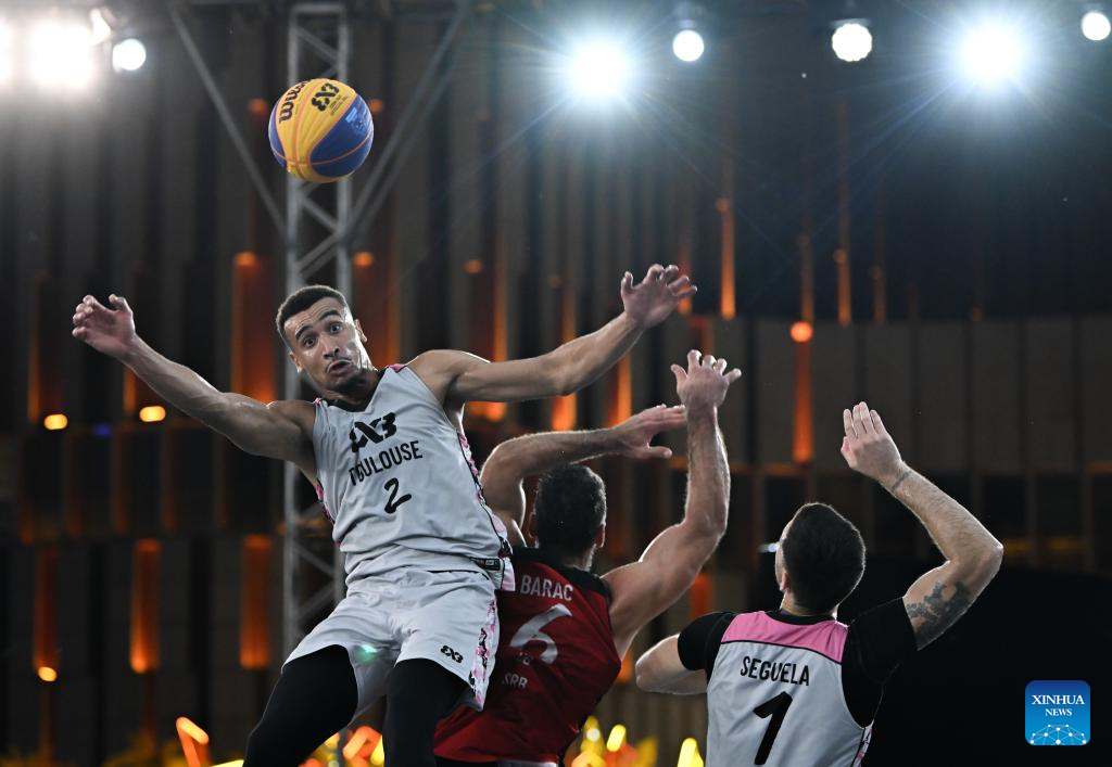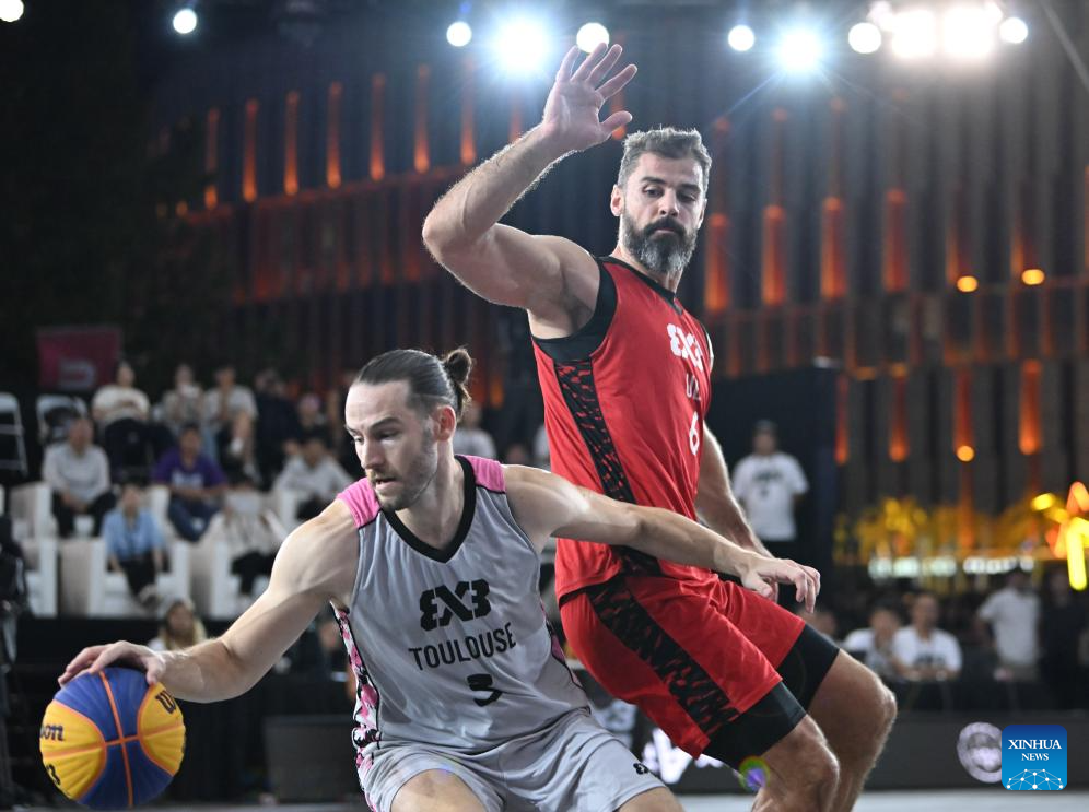 Paul Djoko (L) and Franck Seguela (R) of Toulouse vies with Nemanja Barac of Ub during the final match between Ub of Serbia and Toulouse of France at the International Basketball Federation (FIBA) 3x3 Tianjin Challenger in north China's Tianjin, Oct. 2, 2025. (Xinhua/Sun Fanyue)