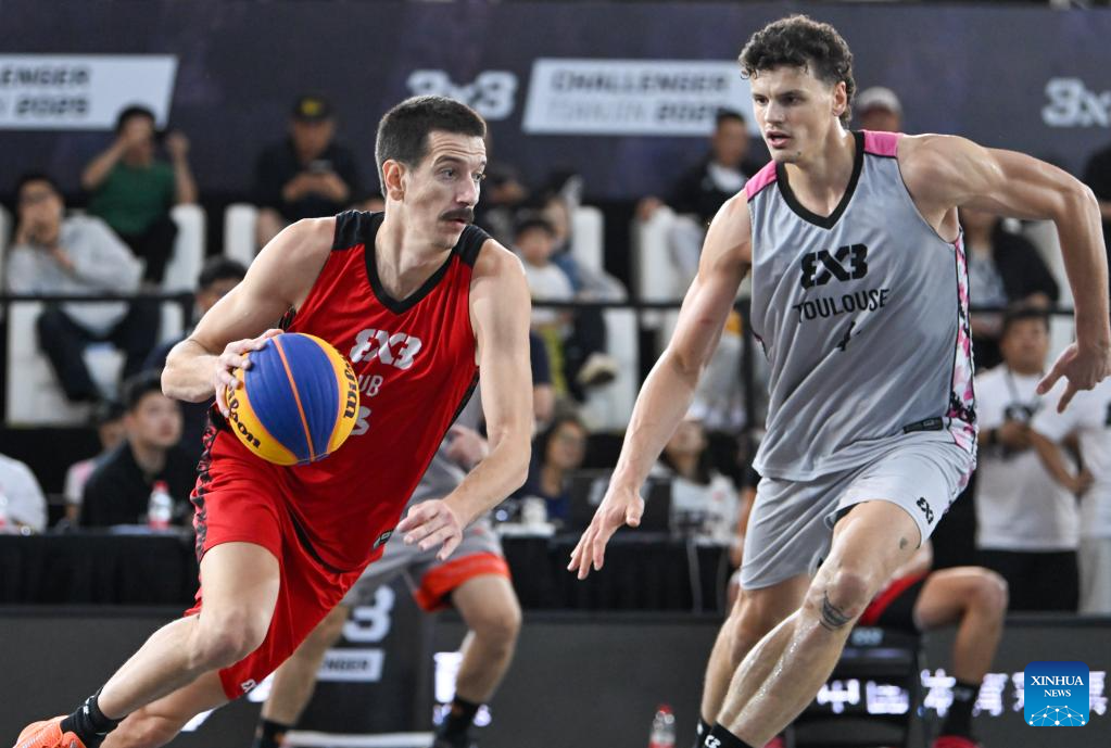 Nemanja Barac (L) of Ub vies with Jules Rambaut of Toulouse during the final match between Ub of Serbia and Toulouse of France at the International Basketball Federation (FIBA) 3x3 Tianjin Challenger in north China's Tianjin, Oct. 2, 2025. (Xinhua/Sun Fanyue)