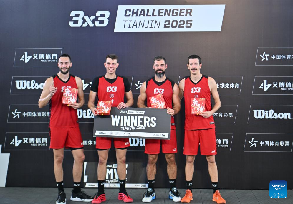 Players of Ub pose during the awarding ceremony after winning the final match between Ub of Serbia and Toulouse of France at the International Basketball Federation (FIBA) 3x3 Tianjin Challenger in north China's Tianjin, Oct. 2, 2025. (Xinhua/Sun Fanyue)