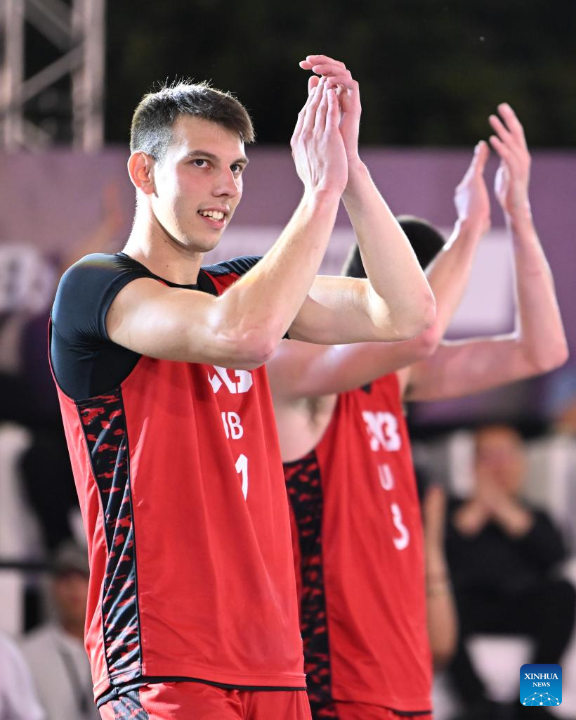 Vuk Vukicevic (L) of Ub celebrates with teammates after the final match between Ub of Serbia and Toulouse of France at the International Basketball Federation (FIBA) 3x3 Tianjin Challenger in north China's Tianjin, Oct. 2, 2025. (Xinhua/Sun Fanyue)