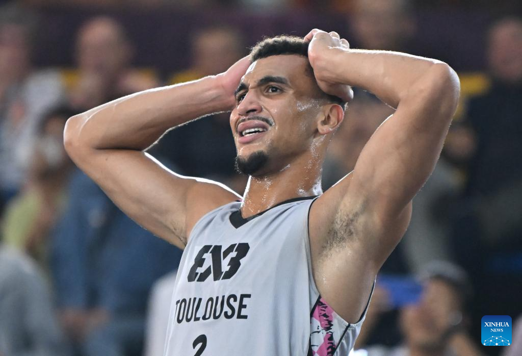 Paul Djoko of Toulouse reacts after the final match between Ub of Serbia and Toulouse of France at the International Basketball Federation (FIBA) 3x3 Tianjin Challenger in north China's Tianjin, Oct. 2, 2025. (Xinhua/Sun Fanyue)