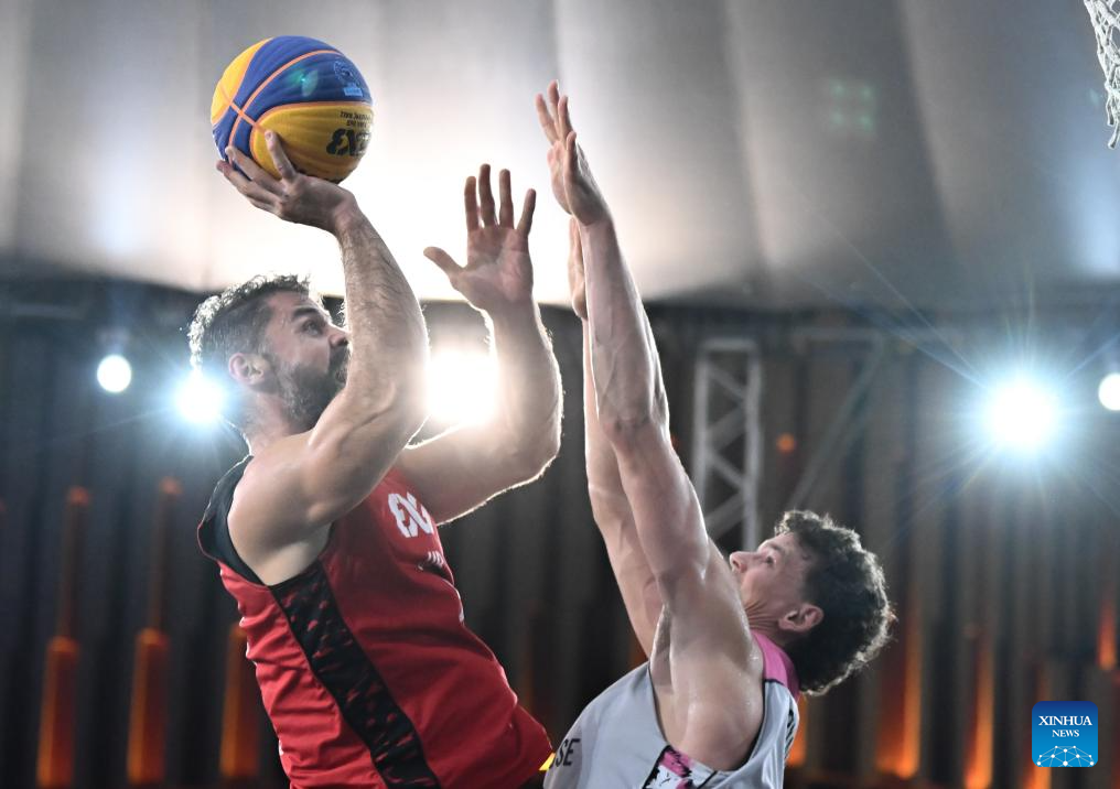 Strahinja Stojacic (L) of Ub vies with Jules Rambaut of Toulouse during the final match between Ub of Serbia and Toulouse of France at the International Basketball Federation (FIBA) 3x3 Tianjin Challenger in north China's Tianjin, Oct. 2, 2025. (Xinhua/Sun Fanyue)