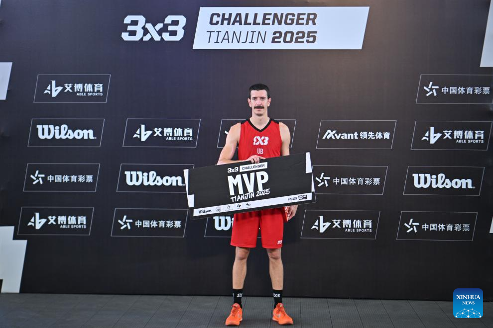 Strahinja Stojacic of Ub poses after winning the MVP title in the final match between Ub of Serbia and Toulouse of France at the International Basketball Federation (FIBA) 3x3 Tianjin Challenger in north China's Tianjin, Oct. 2, 2025. (Xinhua/Sun Fanyue)