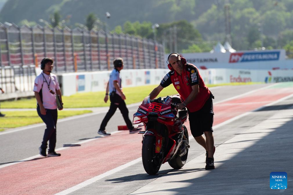 A staff memeber of Ducati Lenovo Team pushes Marc Marquez's bike after the practice of MotoGP at Pertamina Grand Prix of Indonesia 2025 in Lombok Island, Indonesia on Oct. 3, 2025. (Xinhua/Veri Sanovri)