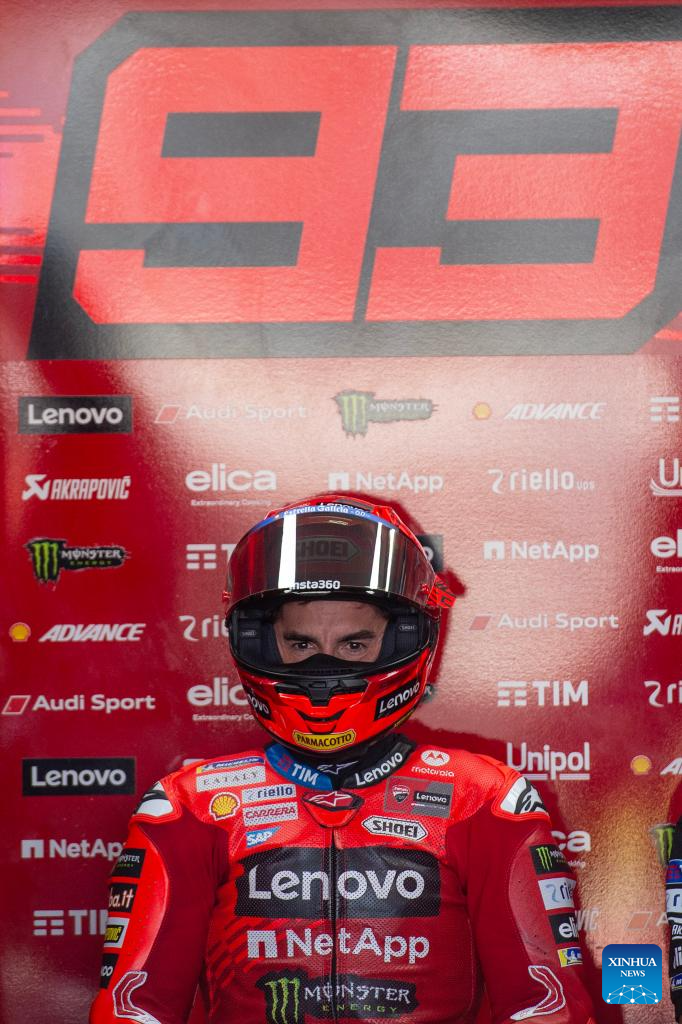 Marc Marquez of Ducati Lenovo reacts before the practice of MotoGP at Pertamina Grand Prix of Indonesia 2025 in Lombok Island, Indonesia on Oct. 3, 2025. (Xinhua/Veri Sanovri)