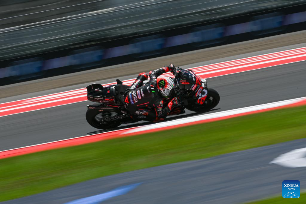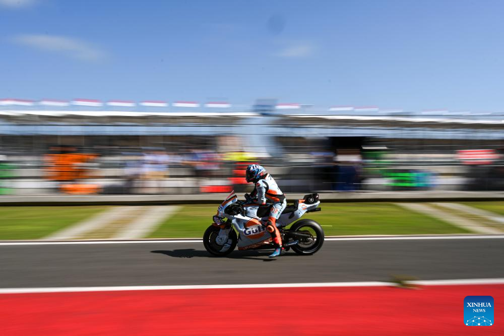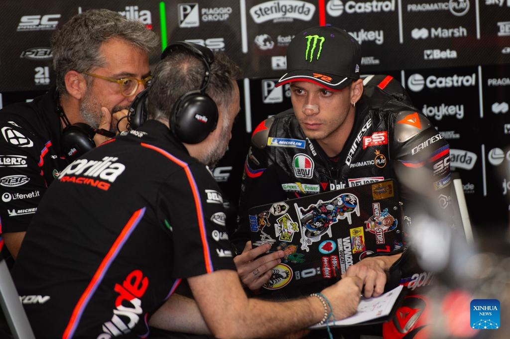 Marco Bezzecchi of Aprilia Racing competes during the free practice Nr. 1 of MotoGP at Pertamina Grand Prix of Indonesia 2025 in Lombok Island, Indonesia on Oct. 3, 2025. (Xinhua/Veri Sanovri)