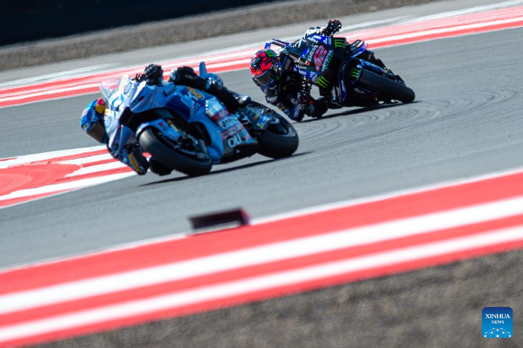 Riders compete during the practice of MotoGP at Pertamina Grand Prix of Indonesia 2025 in Lombok Island, Indonesia on Oct. 3, 2025. (Xinhua/Veri Sanovri)