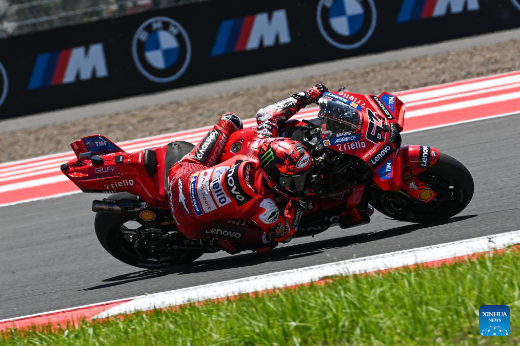 Francesco Bagnaia of Ducati Lenovo Team competes during the free practice Nr. 1 of MotoGP at Pertamina Grand Prix of Indonesia 2025 in Lombok Island, Indonesia on Oct. 3, 2025. (Xinhua/Veri Sanovri)