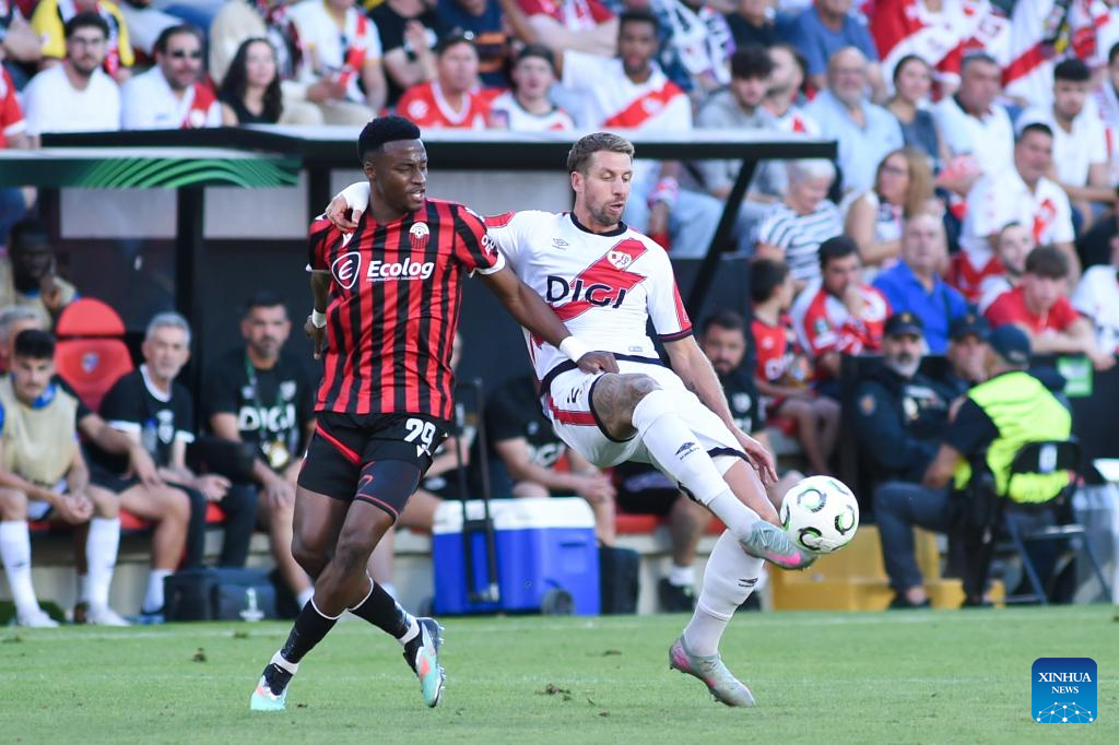Florian Lejeune (R) of Rayo Vallecano vies with Fabrice Tamba of Shkendija during the round 1 match between Rayo Vallecano and Shkendija at the 2025-26 UEFA Conference League in Madrid, Spain, Oct. 2, 2025. (Photo by Gustavo Valiente/Xinhua)