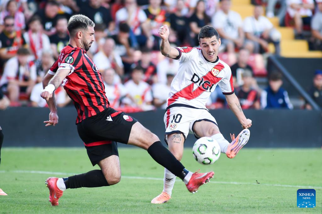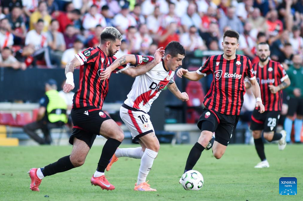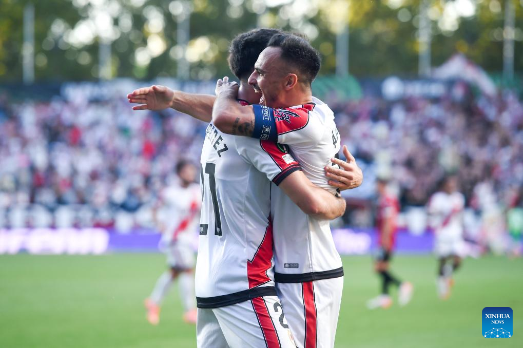 Players of Rayo Vallecano celebrate scoring during the round 1 match between Rayo Vallecano and Shkendija at the 2025-26 UEFA Conference League in Madrid, Spain, Oct. 2, 2025. (Photo by Gustavo Valiente/Xinhua)