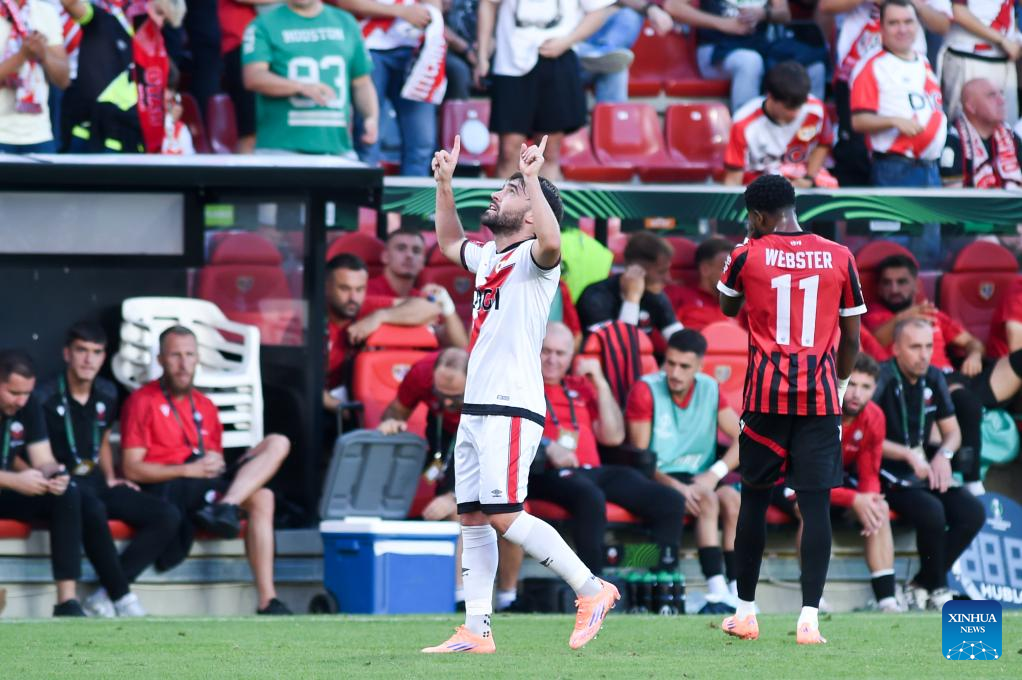 Fran Perez (front) of Rayo Vallecano celebrates scoring during the round 1 match between Rayo Vallecano and Shkendija at the 2025-26 UEFA Conference League in Madrid, Spain, Oct. 2, 2025. (Photo by Gustavo Valiente/Xinhua)