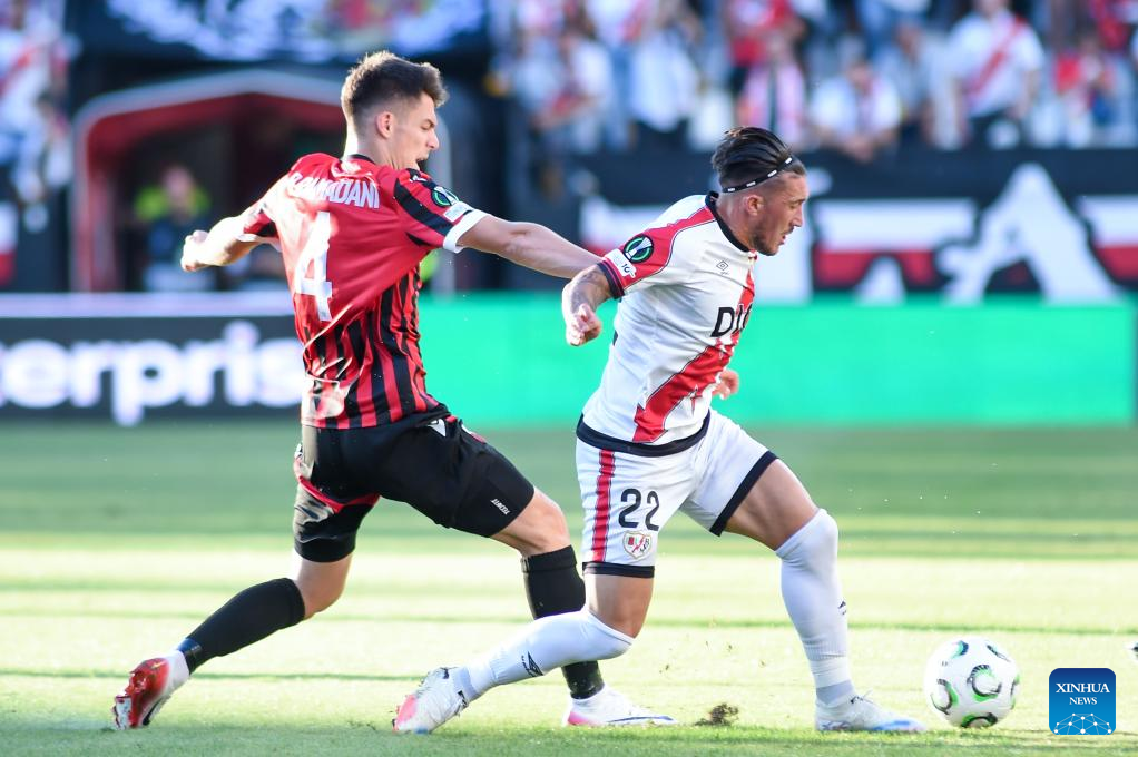 Pacha Espino (R) of Rayo Vallecano vies with Reshat Ramadani of Shkendija during the round 1 match between Rayo Vallecano and Shkendija at the 2025-26 UEFA Conference League in Madrid, Spain, Oct. 2, 2025. (Photo by Gustavo Valiente/Xinhua)