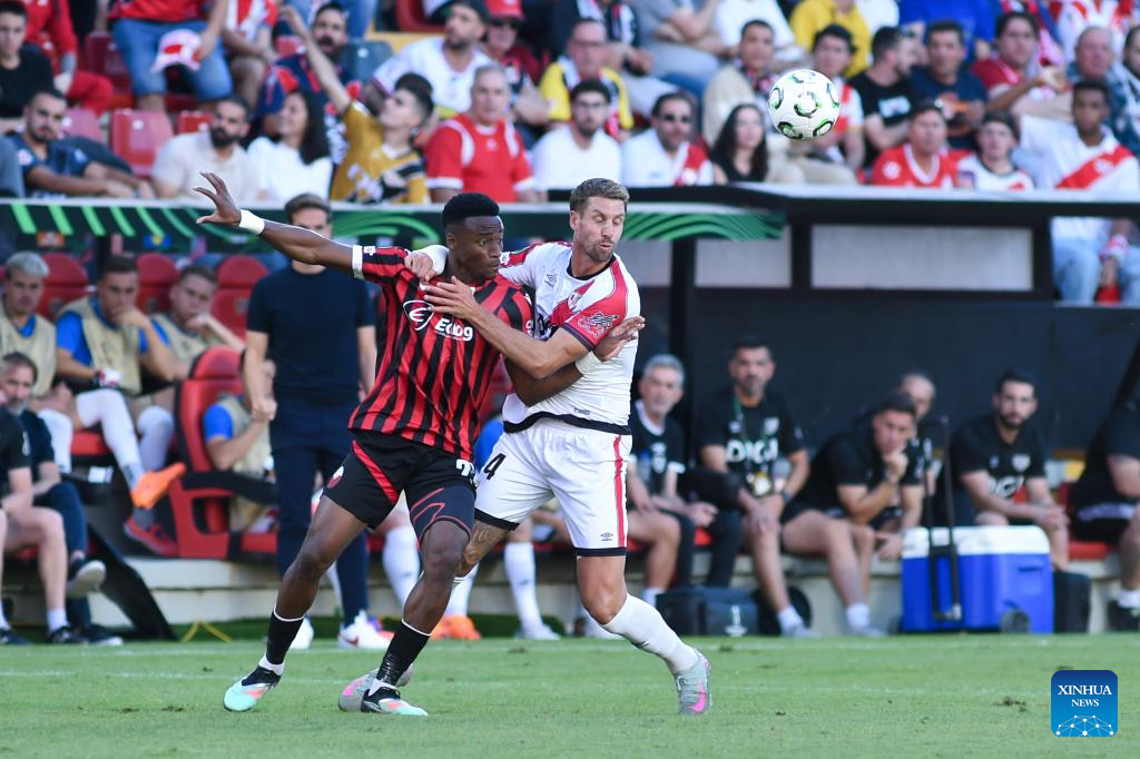 Sergio Camello (R) of Rayo Vallecano vies with Ronaldo Webster (C) of Shkendija during the round 1 match between Rayo Vallecano and Shkendija at the 2025-26 UEFA Conference League in Madrid, Spain, Oct. 2, 2025. (Photo by Gustavo Valiente/Xinhua)