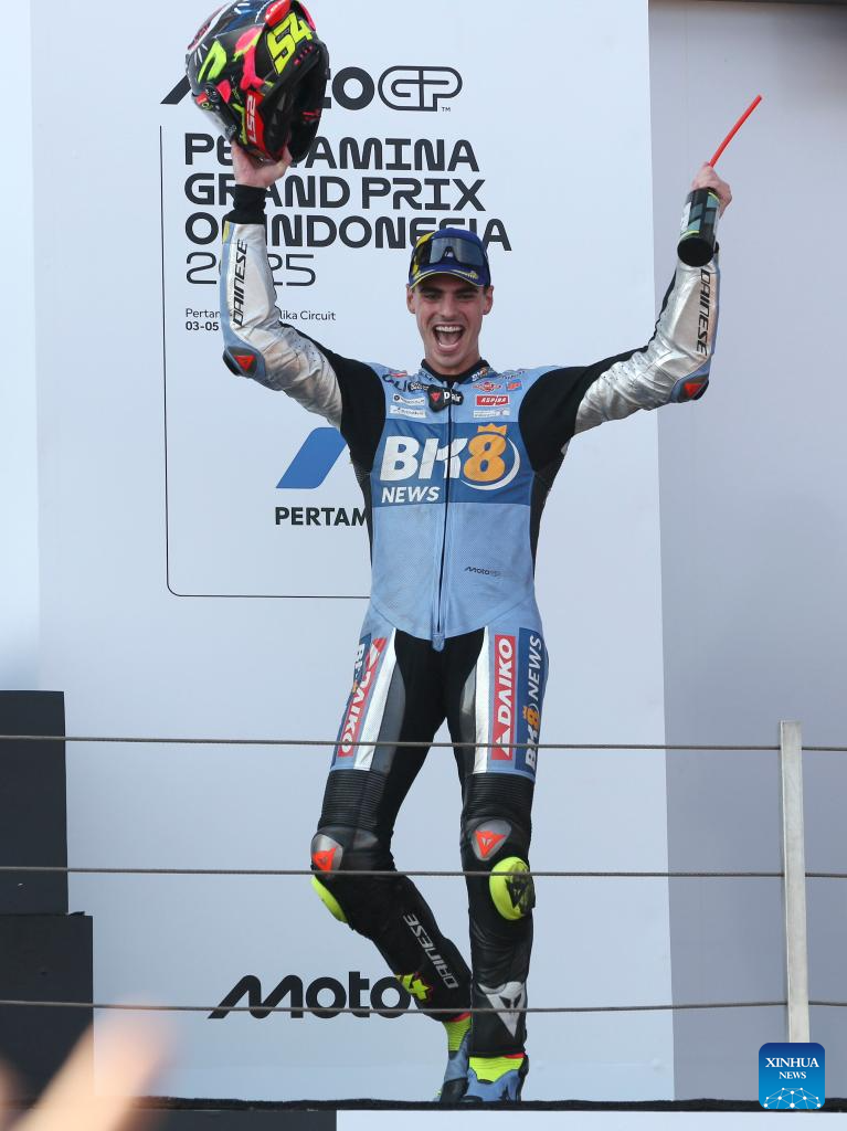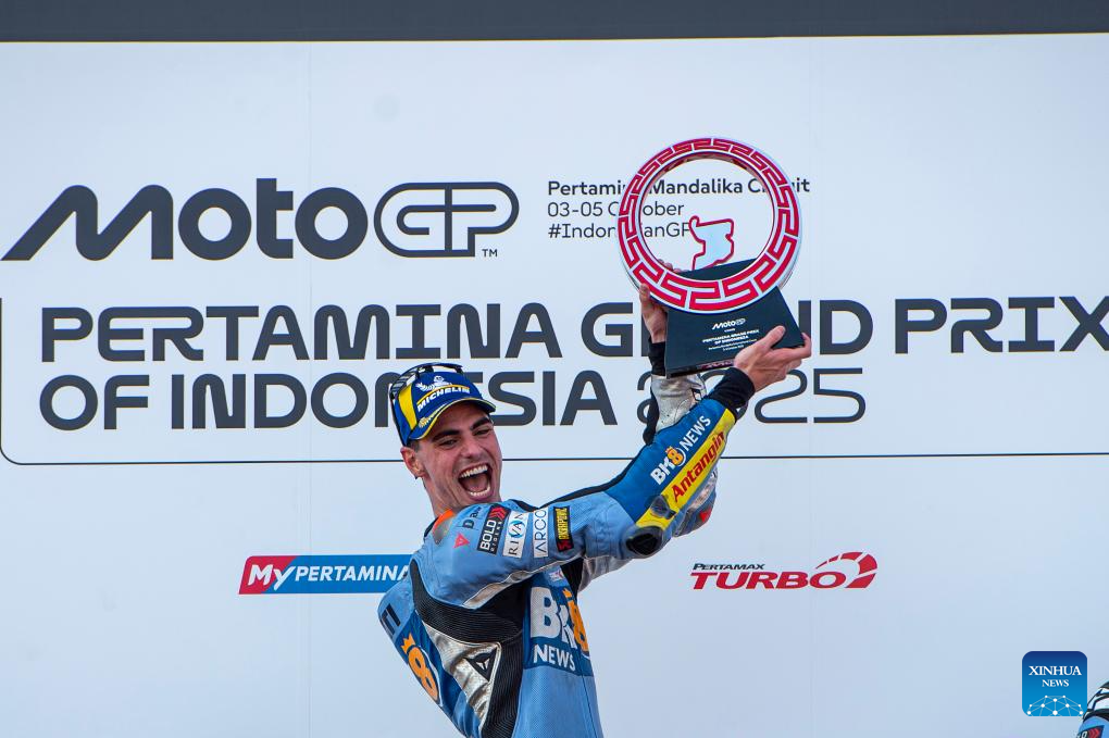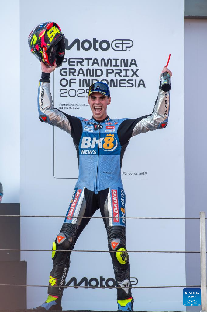 BK8 Gresini Racing MotoGP's Spanish rider Fermin Aldeguer celebrates on the podium after winning the MotoGP race at the Pertamina Grand Prix of Indonesia 2025, held at the Pertamina Mandalika Circuit in Lombok Island, Indonesia, on Oct. 5, 2025. (Xinhua/Veri Sanovri)
