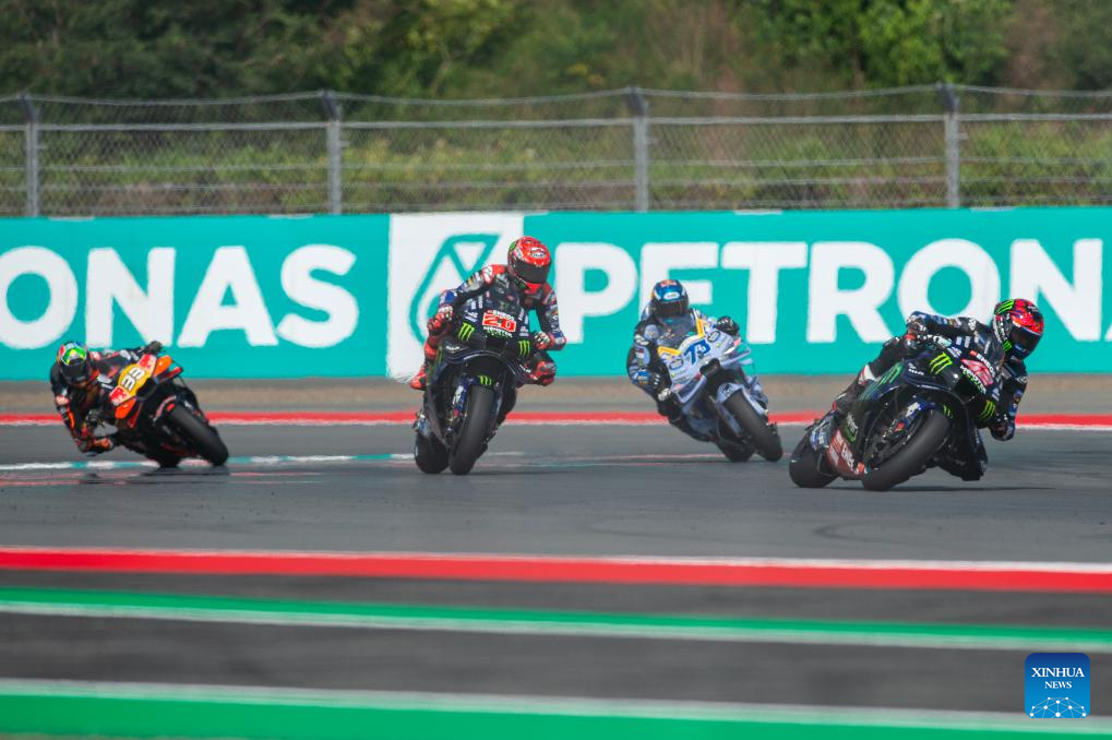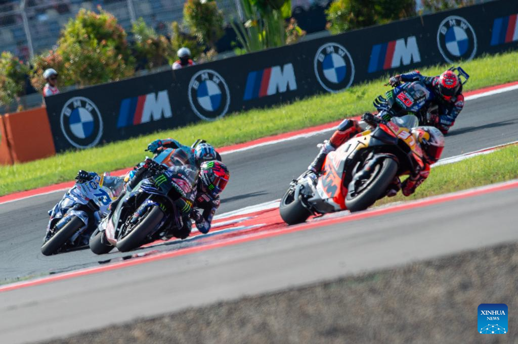 BK8 Gresini Racing MotoGP's Spanish rider Alex Marquez (2nd R) chases Monster Energy Yamaha MotoGP's French rider Fabio Quartararo (2nd L) and Monster Energy Yamaha MotoGP's Spanish rider Alex Rins (1st R) in the MotoGP race at the Pertamina Grand Prix of Indonesia 2025, held at the Pertamina Mandalika Circuit in Lombok Island, Indonesia, on Oct. 5, 2025. (Xinhua/Veri Sanovri)