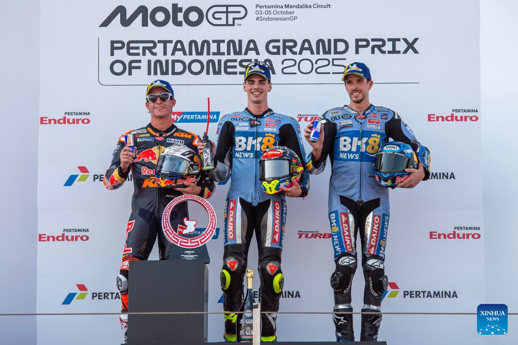 First-placed BK8 Gresini Racing MotoGP's Spanish rider Fermin Aldeguer (C), second-placed Red Bull KTM Factory Racing's Spanish rider Pedro Acosta and third-placed BK8 Gresini Racing MotoGP's Spanish rider Alex Marquez pose on the podium after the MotoGP race at the Pertamina Grand Prix of Indonesia 2025, held at the Pertamina Mandalika Circuit in Lombok Island, Indonesia, on Oct. 5, 2025. (Xinhua/Veri Sanovri)