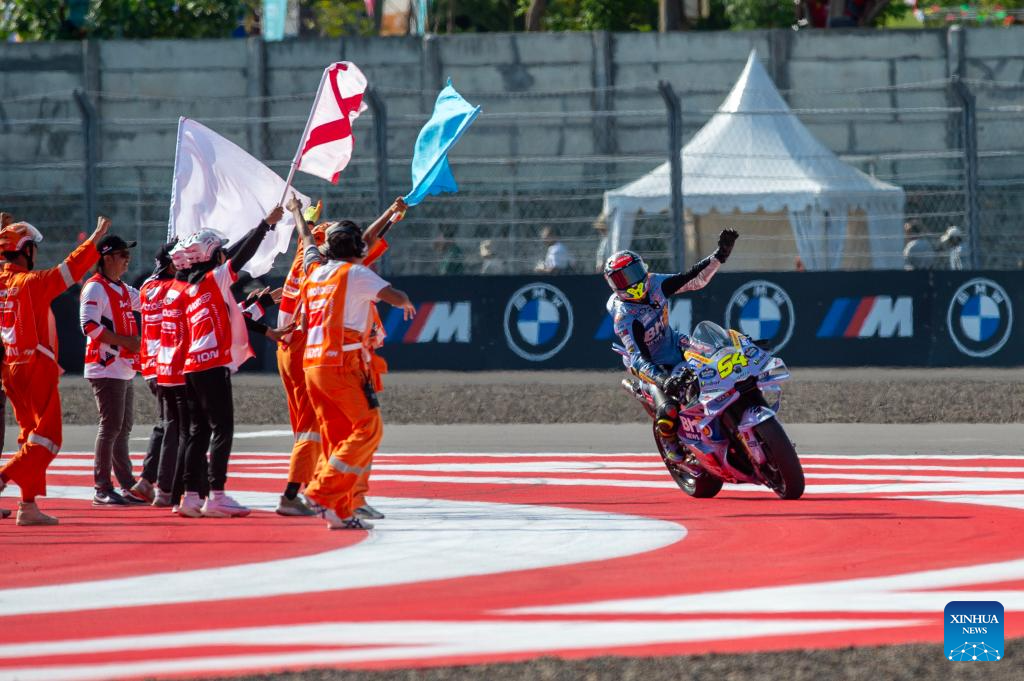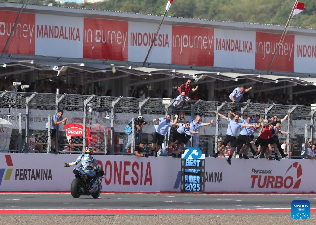 First-placed BK8 Gresini Racing MotoGP's Spanish rider Fermin Aldeguer celebrates with his team after winning the MotoGP race at the Pertamina Grand Prix of Indonesia 2025, held at the Pertamina Mandalika Circuit in Lombok Island, Indonesia, on Oct. 5, 2025. (Xinhua/Cen Yunpeng)