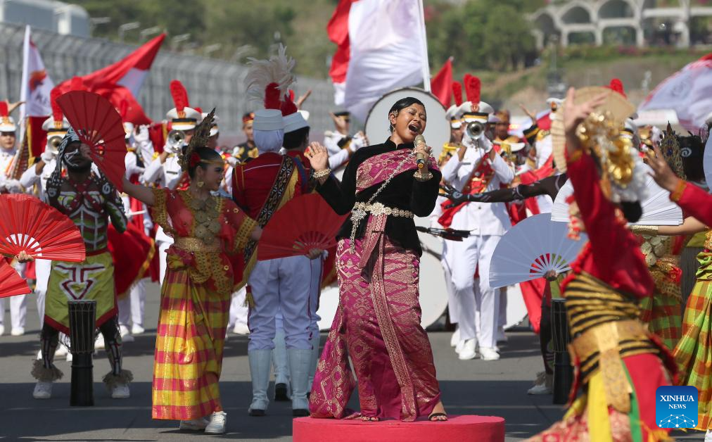 Performers put on a show before the MotoGP race at the Pertamina Grand Prix of Indonesia 2025, held at the Pertamina Mandalika Circuit in Lombok Island, Indonesia, on Oct. 5, 2025. (Xinhua/Cen Yunpeng)