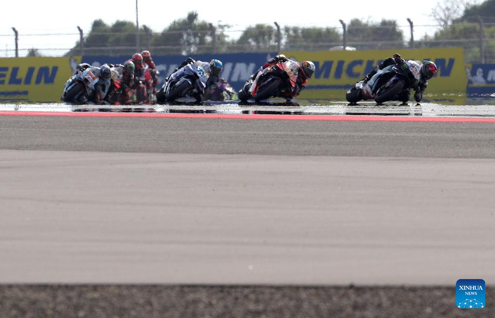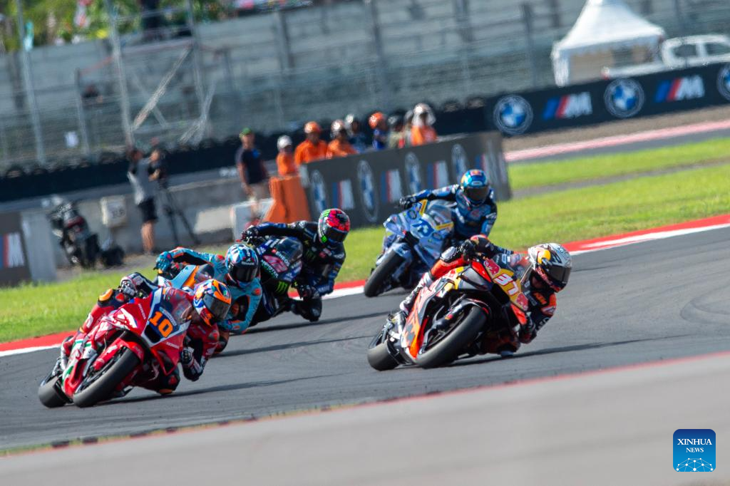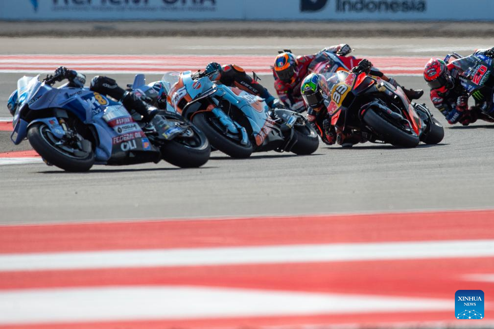 Riders compete in the MotoGP race at the Pertamina Grand Prix of Indonesia 2025, held at the Pertamina Mandalika Circuit in Lombok Island, Indonesia, on Oct. 5, 2025. (Xinhua/Veri Sanovri)