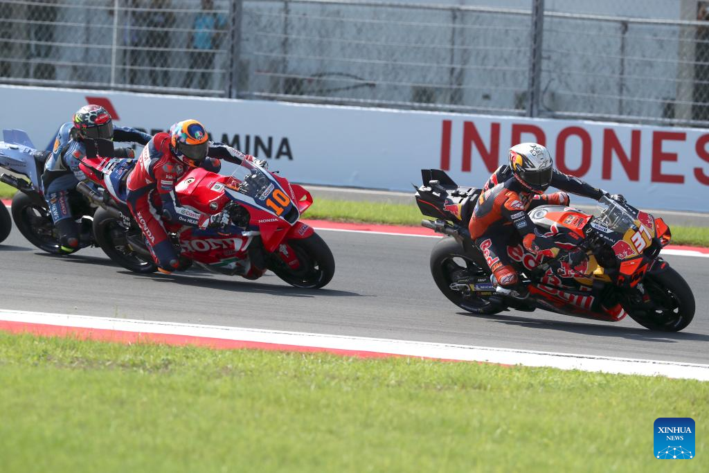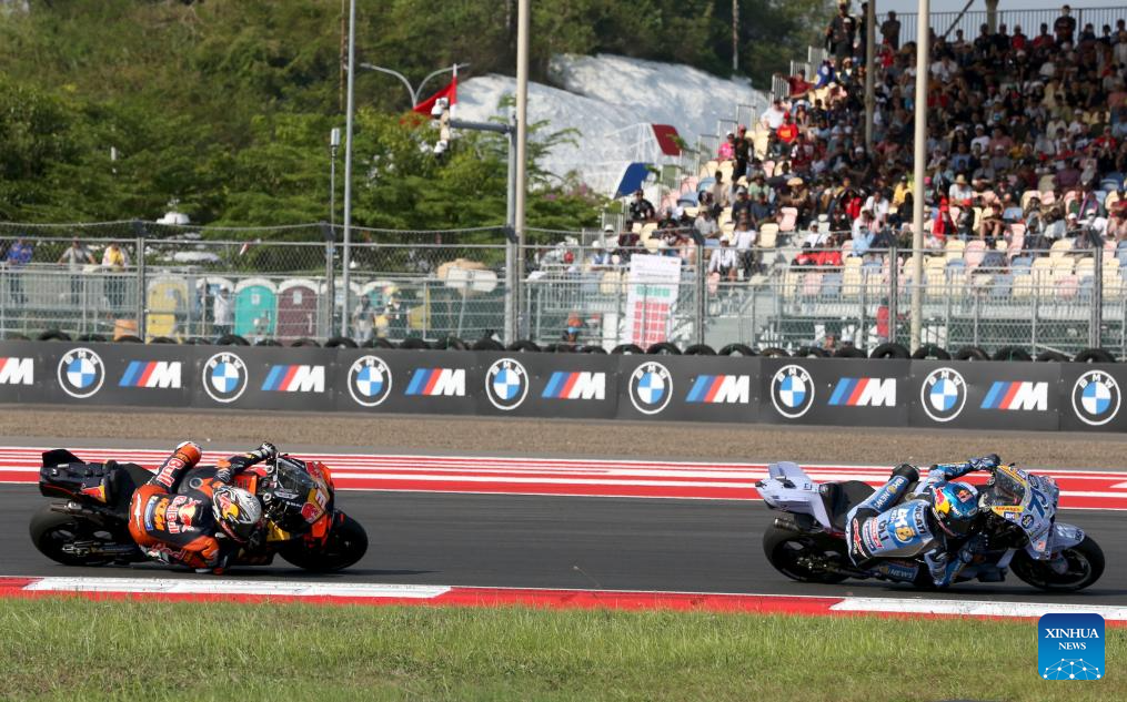 Red Bull KTM Factory Racing's Spanish rider Pedro Acosta (L) chases BK8 Gresini Racing MotoGP's Spanish rider Alex Marquez in the MotoGP race at the Pertamina Grand Prix of Indonesia 2025, held at the Pertamina Mandalika Circuit in Lombok Island, Indonesia, on Oct. 5, 2025. (Xinhua/Cen Yunpeng)