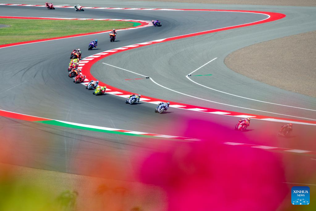 Riders compete in the MotoGP race at the Pertamina Grand Prix of Indonesia 2025, held at the Pertamina Mandalika Circuit in Lombok Island, Indonesia, on Oct. 5, 2025. (Xinhua/Cen Yunpeng)