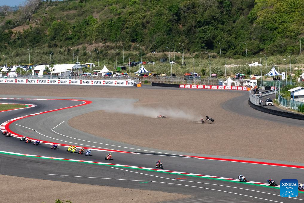 Ducati Lenovo Team's Spanish rider Marc Marquez (top L) and Aprilia Racing's Italian rider Marco Bezzecchi (top R) crash in the MotoGP race at the Pertamina Grand Prix of Indonesia 2025, held at the Pertamina Mandalika Circuit in Lombok Island, Indonesia, on Oct. 5, 2025. (Xinhua/Veri Sanovri)