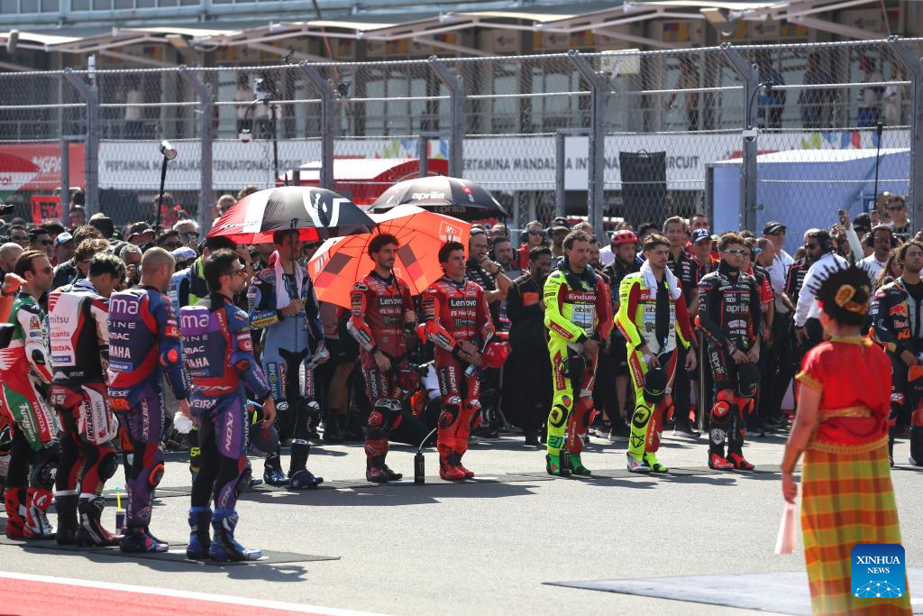 Riders attend the national anthem ceremony before the MotoGP race at the Pertamina Grand Prix of Indonesia 2025, held at the Pertamina Mandalika Circuit in Lombok Island, Indonesia, on Oct. 5, 2025. (Xinhua/Cen Yunpeng)