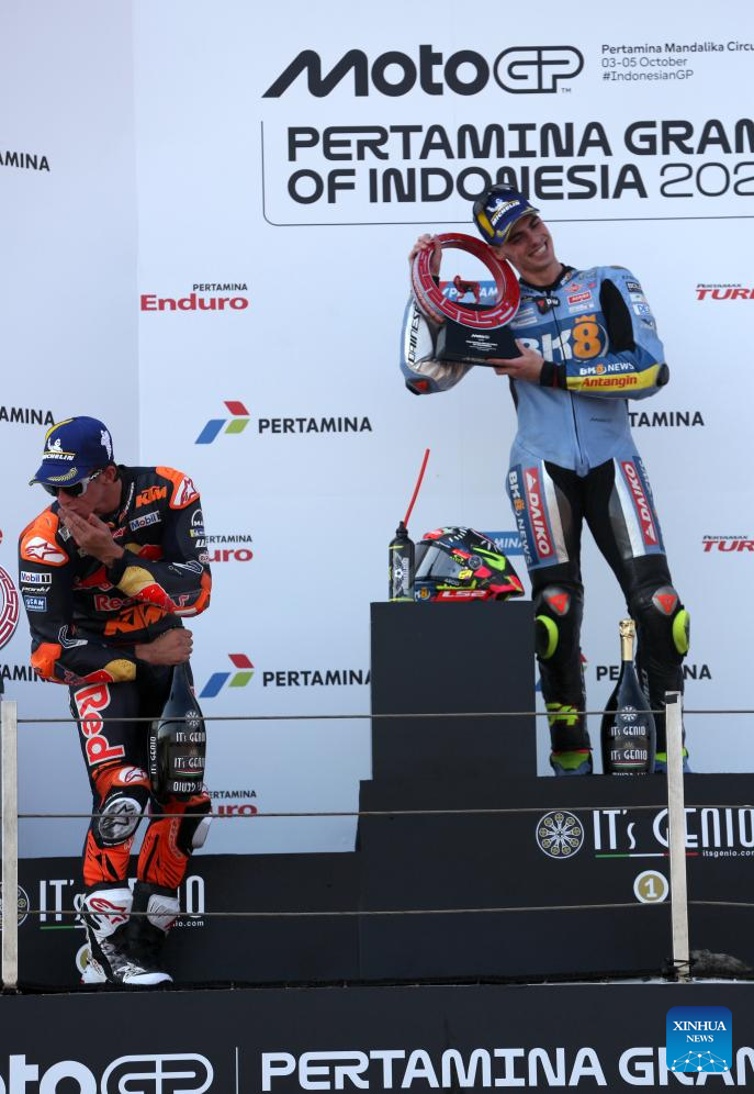 First-placed BK8 Gresini Racing MotoGP's Spanish rider Fermin Aldeguer (R) and second-placed Red Bull KTM Factory Racing's Spanish rider Pedro Acosta celebrate on the podium after the MotoGP race at the Pertamina Grand Prix of Indonesia 2025, held at the Pertamina Mandalika Circuit in Lombok Island, Indonesia, on Oct. 5, 2025. (Xinhua/Cen Yunpeng)