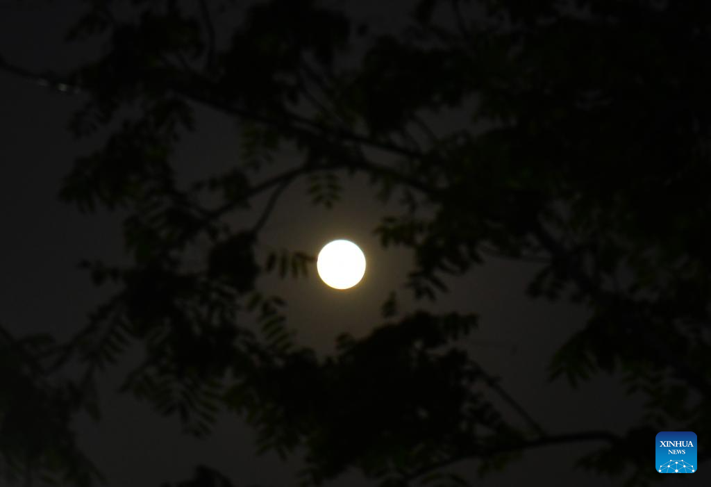 The full moon is seen shining through tree branches in Damascus, Syria, Oct. 6, 2025. (Photo by Ammar Safarjalani/Xinhua)